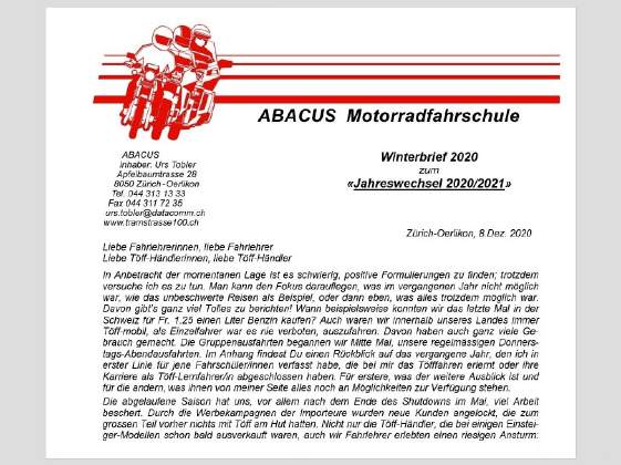 Nun wünsche ich allen meinen Freunden, allen Berufskollegen und –kolleginnen, der ganzen Töff- Familie, den Töff- und Bekleidungs-Händlern und wer alles damit zu tun hat, eine schöne Adventszeit, frohe Feiertage und en gute Rutsch ins neue Jahr! Und für uns alle hoffe ich natürlich, dass dieser Spuk, der uns nun schon bald ein Jahr begleitet, möglichst bald vorbeigeht!