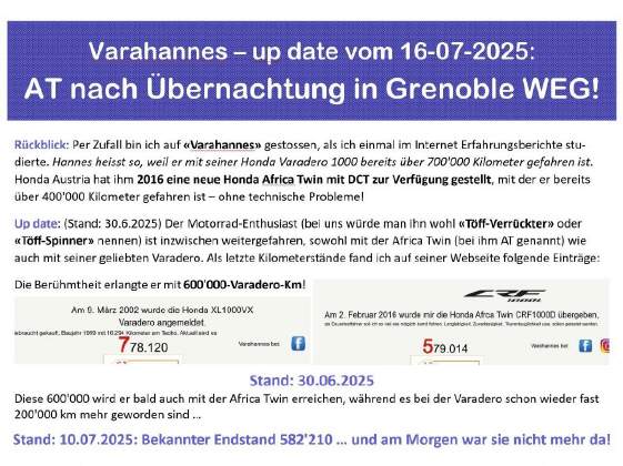 Up date: (Stand: 30.6.2025) Der Motorrad-Enthusiast (bei uns würde man ihn wohl «Töff-Verrückter» oder «Töff-Spinner» nenen) ist inzwischen weitergefahren, sowohl mit der Africa Twin (bei ihm AT genannt) wie auch mit seiner geliebten Varadero. Als letzte Kilometerstände fand ich auf seiner Webseite folgende Einträge: