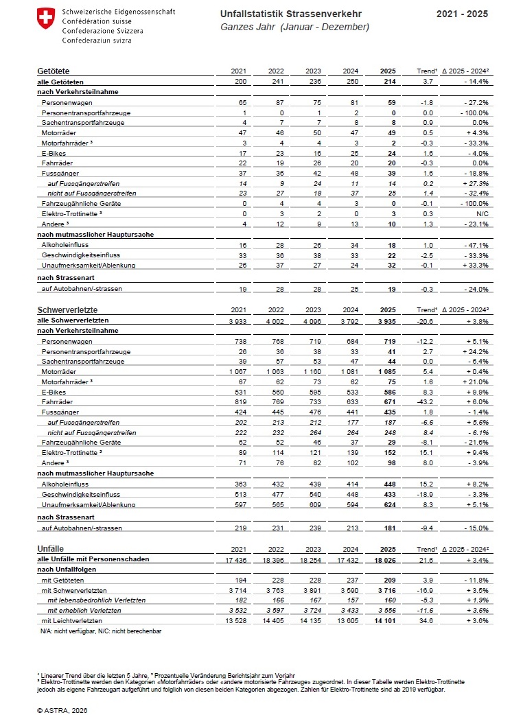 Bern, 19.03.2026 Strassenverkehrsunfälle 2025: Weniger Todesfälle, mehr Schwerverletzte Pressemitteilung als PDF [189 KB]