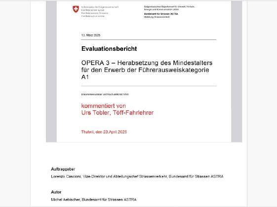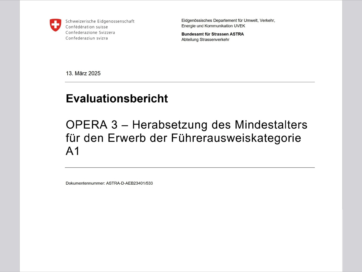 Der Evaluations-Bericht (Original) vom 13.03.2025 zu den Unfallzahlen 2021-2023 der neuen Kategorie A1 für 15- bis 17-Jährige als PDF [527 KB]