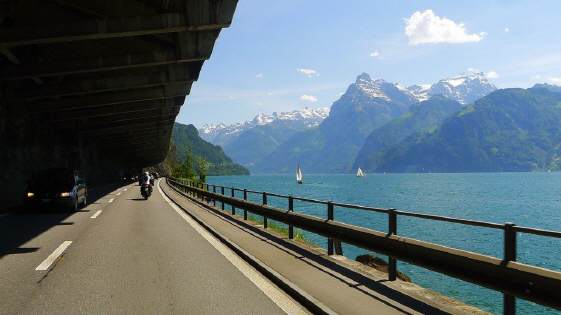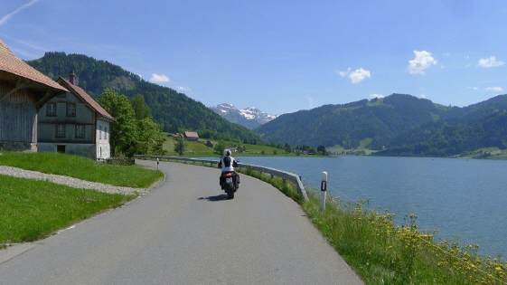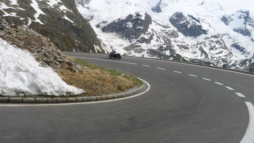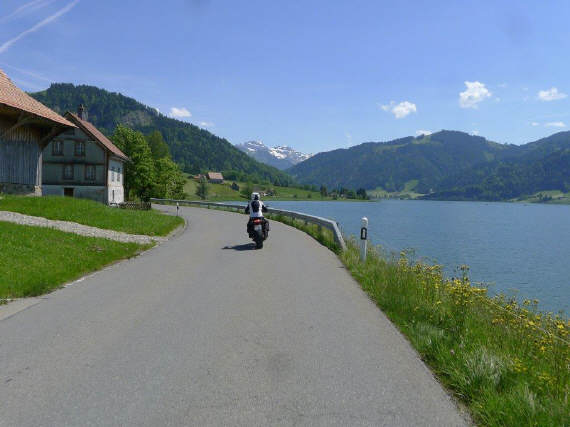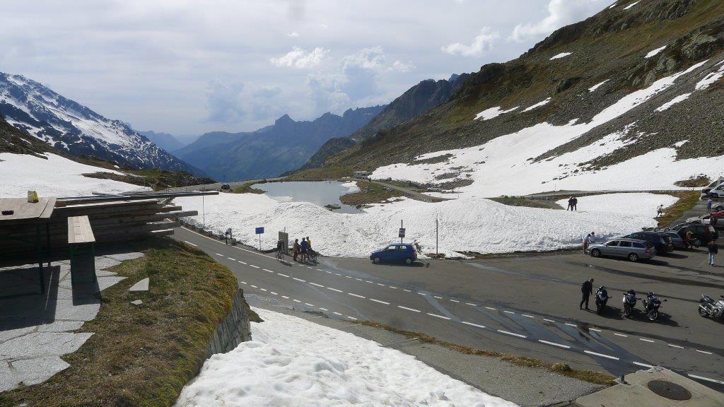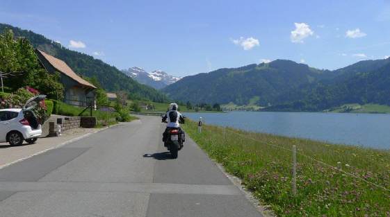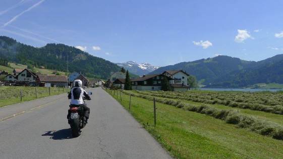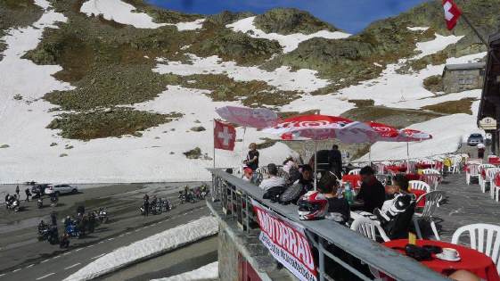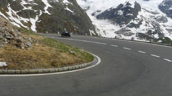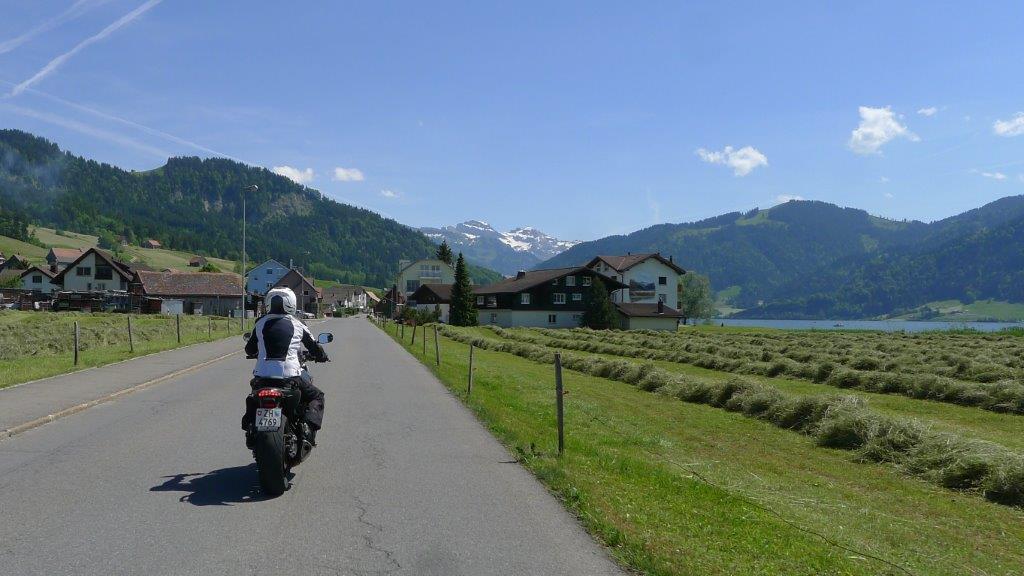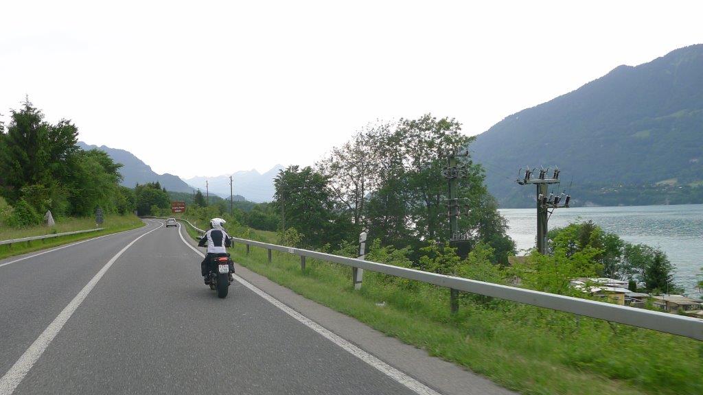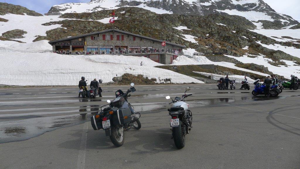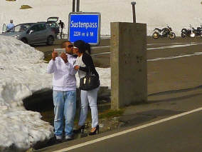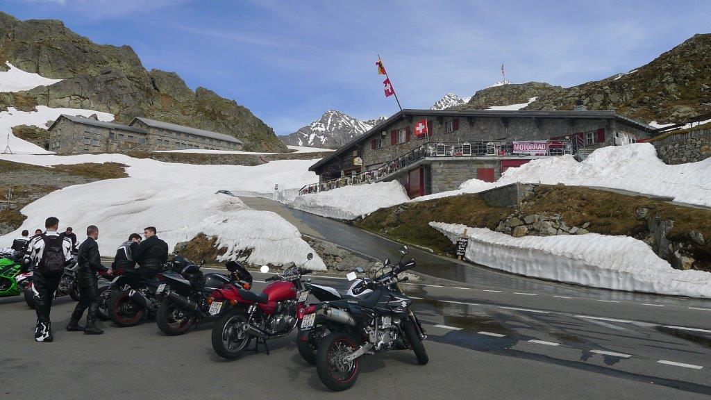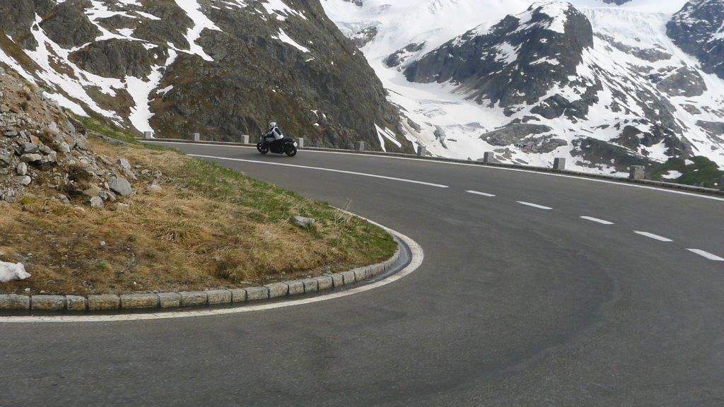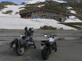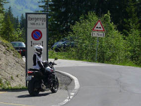 Zurück von unserem tollen Ausflug in der Höhe, der grandiosen Aussicht auf die 2 Seen und natürlich aufs Flugplatzgelände, landeten wir zurück im Oberländerhof. Wir berappten unser Hotelzimmer und wurden von den netten Wirtsleuten mit guten Wünschen auf unseren Heimweg entlassen. Dieser führte erst mal bis nach Iseltwald auf einer sehr schmalen Strasse, entlang des Strandes des Brienzersees, welcher dicht bepackt von Sonntagsausflüglern war trotz wohl eher lauen Wassertemperaturen, wo wir zum Glück nie auf das verkehrende Postauto trafen: Ich weiss nicht, wie die Chauffeure dies machen bei Gegenverkehr, wir hatten oft schon Mühe, mit Autos zu kreuzen. Dann gings auf die Schnellstrasse zurück nach Innertkirchen, wo wir diesmal in Richtung Wallis abbogen, die gut ausgebaute neue Grimsel-Passstrasse, welche ich anfangs meiner Töff-Karriere vor 40 Jahren noch ganz anders erlebt hatte. Sie wurde aus militär-strategischen Gründen so stark ausgebaut, so dass sie auf weiten Teilen schon fast zur «Autobahn» verkommen ist. So ist es auch äusserst schwierig, die national verordneten 80 Stundenkilometer ausserorts einzuhalten! Mit uns waren hunderte von Töfffahrern unterwegs an diesem Wochenende. Auf der Passhöhe (2165 m ü.M.) kehrten wir zum Zvieri ein und beobachteten das illustere Geschehen, konnte man doch sowohl die Strasse wie auch den Parkplatz von hier aus beobachten. Die Fahrer und Fahrerinnen fuhren einzeln, in Zweier- oder Dreier-Gruppen, zum Teil auch ganze Töff-Klubs waren unterwegs. Auf der Abfahrt in Richtung Gletsch fotografierte ich und verlor Sigrid, die vorausgefahren war, an einer Baustelle aus den Augen. Weiter unten wartete sie auf mich, wo wir den Einstieg in den Furkapass erreichten. Auf dieser Seite ist die Strasse zwar auch etwas breiter geworden, aber die Strassenführung ist immer noch dieselbe. So gesehen zeigt der Furka-, wie auch der Klausen-Pass über weite Strecken noch die Ursprünglichkeit der schweizerischen Alpenpässe. Diesmal legten wir keine Pause auf der Passhöhe (2459 m ü.M.) ein, sondern fuhren gleich die Strasse hinunter nach Realp, wo wir wieder auf eine längere Baustelle stiessen. Der Vorteil ist, dass man danach jeweils praktisch verkehrsfreie Fahrt hat … In Hospenthal trafen wir auf die Gotthard-Strecke, die an diesem Sonntag natürlich auch stark befahren war. So schlossen wir uns unterhalb der Teufelsbrücke bei Andermatt dem Tatzelwurm an, der sich durch die Schöllenenschlucht hinunterwälzte, überholen verboten und auch bei dem starken Ausflüglerverkehr wenig zu empfehlen. Ab Göschenen befuhren wir wieder die alte Gotthard-Strasse, um in Altdorf den Klausen-Pass anzupeilen. Inzwischen war es schon recht spät und nur wenige waren noch unterwegs. Wir liessen es zügig fliegen … – schon bald kehrten wir im Hotel Klausenpass ein.