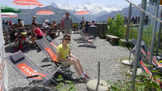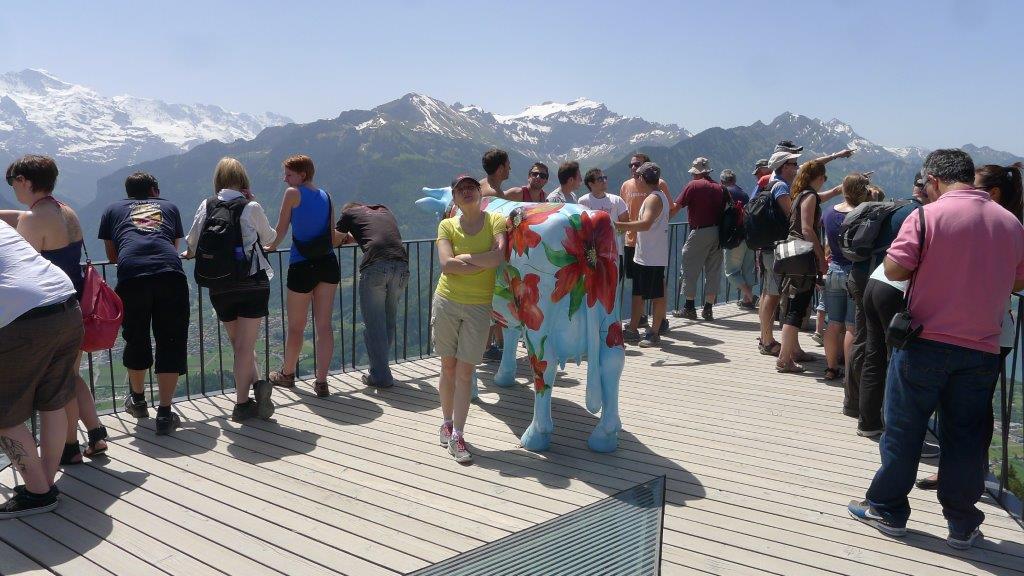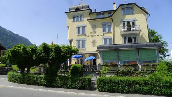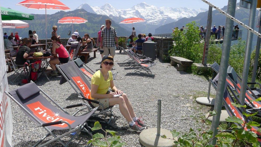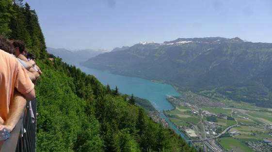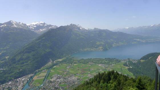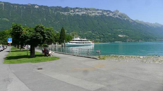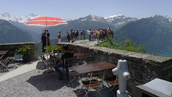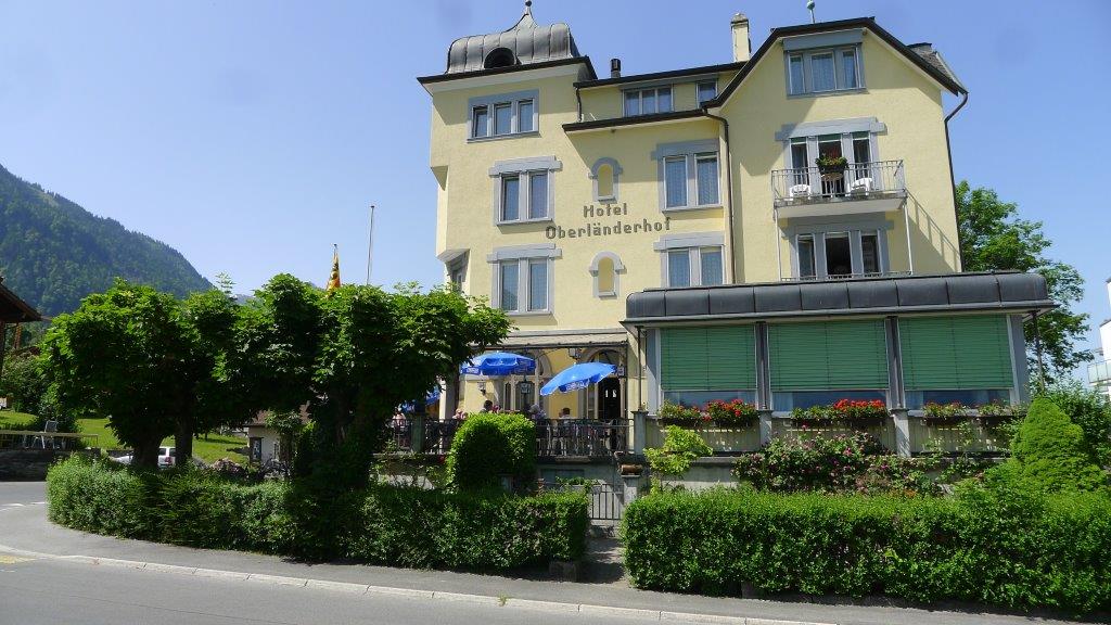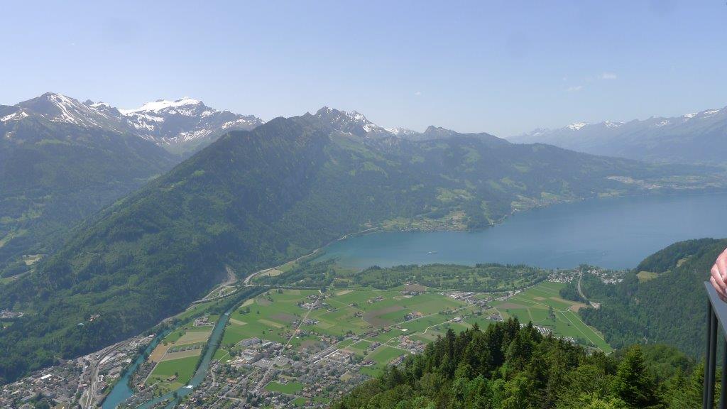 Schon früh zu dieser Jahreszeit ist es hell, aber hier in den Bergen geht es etwas länger, bis die Sonnenstrahlen auch am Talboden ankommen. Kurz vor 9 Uhr, nach rund 10 Stunden tiefem Schlaf, mochten wir den neuen Tag nicht länger ignorieren und schon bald fanden wir uns frisch geduscht am selben Platz im Bella Vista, diesmal zum Frühstück. Unsere Tischnachbarn, aus Nordirland, die schon seit 24 Jahren immer wieder hierher kommen, wünschten uns auf Deutsch „Einen schönen Tag“ und machten sich auf zu einem kleinen Morgenspaziergang an der Seepromenade. Es ist so idyllisch hier, wir wähnten uns fast in den Ferien und nicht auf einem 2-Tages-Ausflug oder genauer: 1 ½ Tages-Ausflug. So liessen wir uns wie die Touristen von Jasmin Gerber, der Chefin des Hotels, beraten, wie wir es wohl am besten anstellen, auch etwas schönes auf die schnelle zu erleben. Sie schlug uns einen Ausflug mit der Harder-Bahn vor, wo man von der Terrasse einen wunderbaren Ausblick auf beide Seen, den Thuner wie den Brienzersee hat. Wir konnten, nachdem wir unser Zimmer geräumt hatten, unsere Taschen und Kleider im Sääli deponieren und so starteten wir unseren Ausflug mit dem Bus an den Bahnhof Interlaken-Ost, wo sich gleich auf der anderen Flussseite die Talstation der Harder-Standseilbahn befindet.