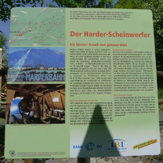 Dass die Leute von damals nicht nur genial waren im Bau von Bahnen, sondern auch im Vermarkten des Tourismus, zeigt folgende schöne Geschichte: Ein Navigationsscheinwerfer, gebaut für ein Kriegsschiff, fand den Weg um 1910 auf den Harder und leuchtete als Werbung ins Tal! Erinnert mich etwas an den Laser-Strahl der Messe Zürich, der bei Veranstaltungen den Weg vom Bahnhof/Tramstation Sternen zur Messe zeigt. Noch viel grössere Pläne standen anfangs des 20.Jahrhundert, die aber vom ersten Weltkrieg eingebremst wurden.