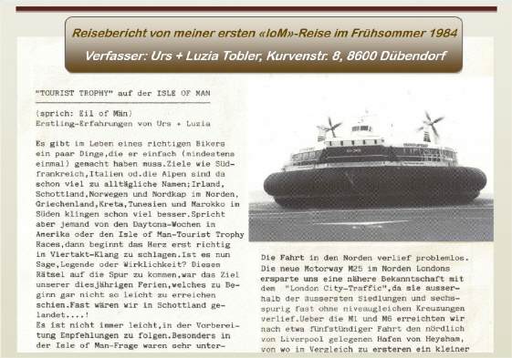 Schon 1984, 1985 und 1992 fuhr ich zu den «TT-Rennen» auf der Insel Man: Um wirklich einen Eindruck zu bekommen, lohnt sich die Anreise bereits in der Vorwoche, in der die Trainingsläufe stattfinden. Am Samstag starten die Rennen mit den ersten beiden Läufen, dann ist ein Tag Rennpause - wegen der Zuschauer wird der Sonntag «Mad Sunday» genannt - und am Montag geht es mit den Rennen weiter... «Isle of Man-TT Races 2011» Für den Bericht auf das Bild rechts klicken! (Seite noch in Arbeit) |