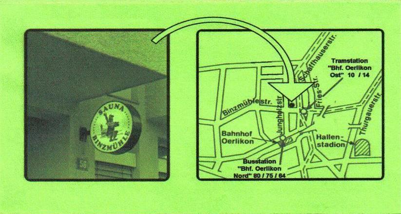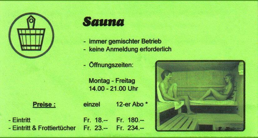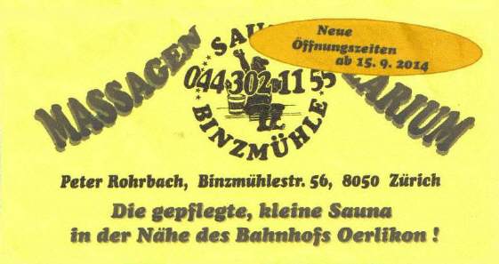Seit 1988 (mit Unterbruch) gehe ich regelmässig im Winter meistens am Donnerstagabend in die Sauna «Binzmühle», die von Peter Rohrbach geführt wird. Im Sommer natürlich nicht, denn dann gibt's ja die regelmässigen Donnerstagsausfahrten: Dann muss Peter meistens auf mich verzichten, es sei denn, ein 17-19 Uhr Fahrschüler fällt aus und es lässt sich kurzfristig kein Ersatz finden! |