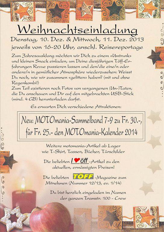 Anlässlich der Weihnachtseinladung kannst Du Dich mit den neusten «motomania»-Artikeln eindecken: Neu Sammelband 7-9, Kalender 2014! |