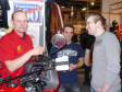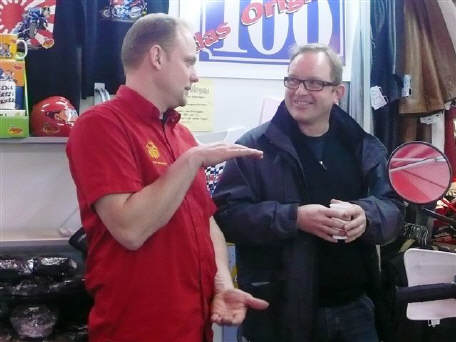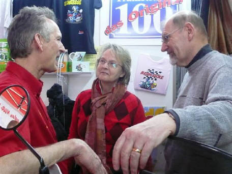 Mit einer Präsenzzeit von 10-21 Uhr ist dieser zweite Ausstellungstag eine Herausforderung für das Standteam. Im Verlauf des Nachmittags konnten wir es uns aber leisten, ab und zu einen Blick in die Ausstellung und Schaus zu werfen. Die «motomania»-Artikel, darunter speziell die schräge Tasse, liefen gut und die beiden Frauen waren riesig stolz auf den erfolgreichen Verkauf. |