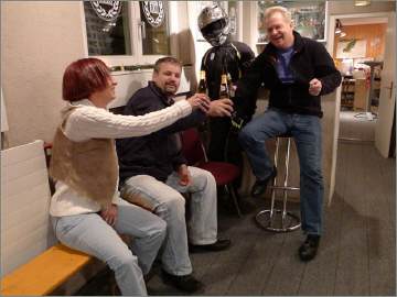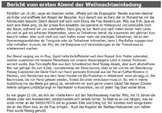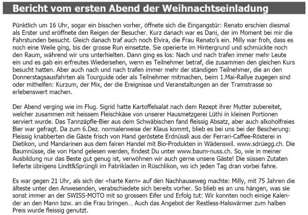 Es war gegen 21 Uhr, als sich der «harte Kern» auf den Nachhauseweg machte: Milly, mit 75 Jahren die älteste unter den Anwesenden, verabschiedete sich bereits vorher. So blieb es an uns hängen, was sie sonst immer an der SWISS-MOTO mit so grossem Eifer und Erfolg tut: Wir konnten noch einige Kalender an den Mann bzw. an die Frau bringen… Auch das Angebot der Restless-Halswärmer zum halben Preis wurde fleissig genutzt.