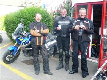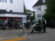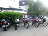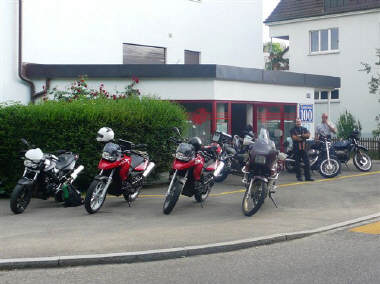 Während ich die Theorie für den Kurventechnik-Kurs erteilen musste, trafen sich insgesamt 7 Maschinen an der Tramstrasse: Ein neuer Rekord, denn es waren 4 (!) Tourguides und weitere 3 als Teilnehmer!!! Arthur übernahm das Szepter und führte die Gruppe an. Über das Zürcher Unterland landeten sie in Würenlingen im Rest. Sternen, und das OHNE REGEN: Während der Zeit des Essens schüttete es dann wirklich aus vollen Kübeln und anschliessend war es für den Heimweg wieder trocken. Glück gehabt! |