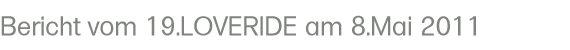 Einmal mehr fand der LOVERIDE bei wunderbarem sonnigen Wetter statt, doch leider trafen nicht die erwarteten 10'000 Motorräder ein: Doch mit 8'100 Töffs und etwa 11'700 Besuchern war es ein tolles Resultat und der Erlös erreichte wieder rund eine halbe Million Franken, die verschiedenen Behindertenverbänden zugeht, vorab an die Muskelkranken. Jedes Jahr staune ich von neuem, wie unheimlich friedlich die ganze Veranstaltung abläuft: Mit Seitenwagen-Motorrädern, mit Trikes und Kabinenmotorrädern wurden nicht weniger als 282 Behinderte ausgefahren - wahrscheinlich DER Höhepunkt für jeden einzelnen, der daran teilhaben darf. Hier wird soviel Freude bereitet und ein grosser Batzen, mehr als eine halbe Million, geht zu Behindertenorganisationen. (für mehr Infos auf das Bild klicken!) |