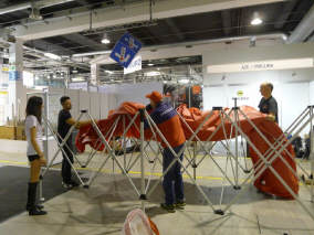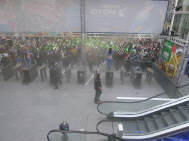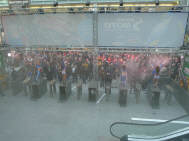 Wenn man die Rolltreppe hochkommt, dann sieht man das Schild des Kyburz-Standes (mein letztjähriger Standort) und gleich rechts davon in der Höhe den "L-Würfel" meiner Fahrschule. DAs rote vZelt ist praktisch abgedeckt durch die in die Höhe bauenden Husquarna- und auch Corner Bank-Stände!