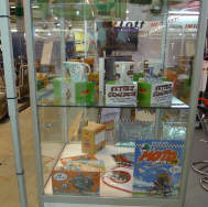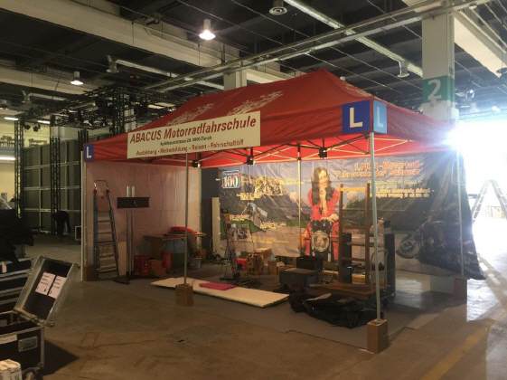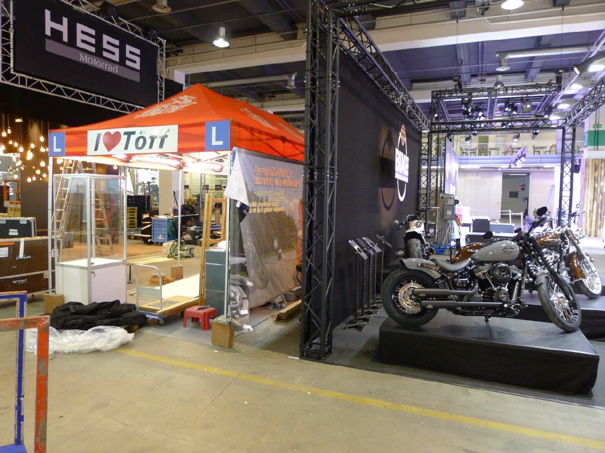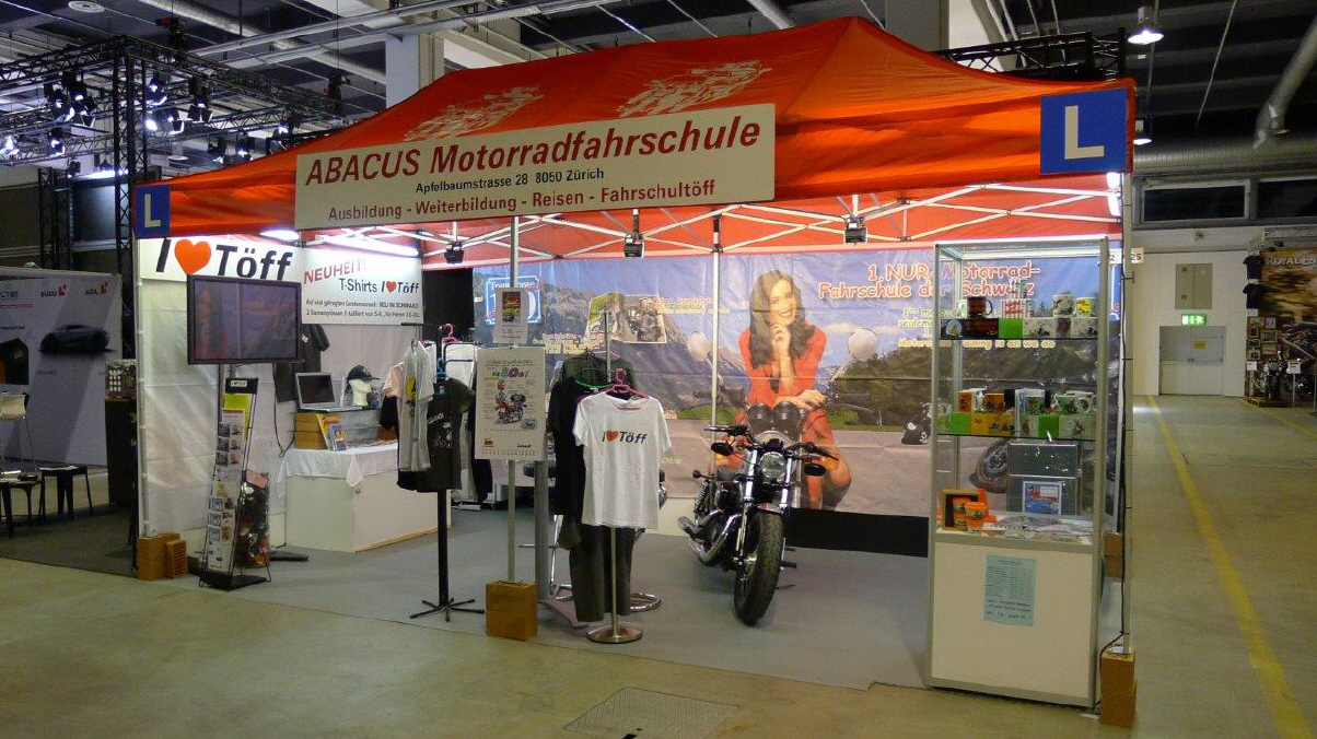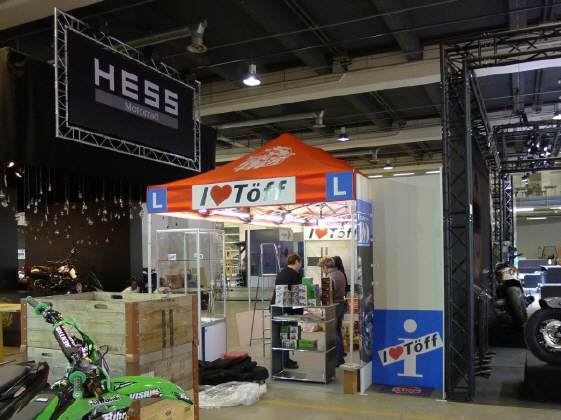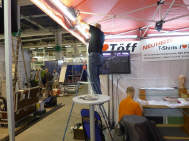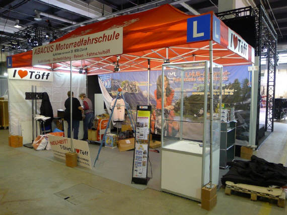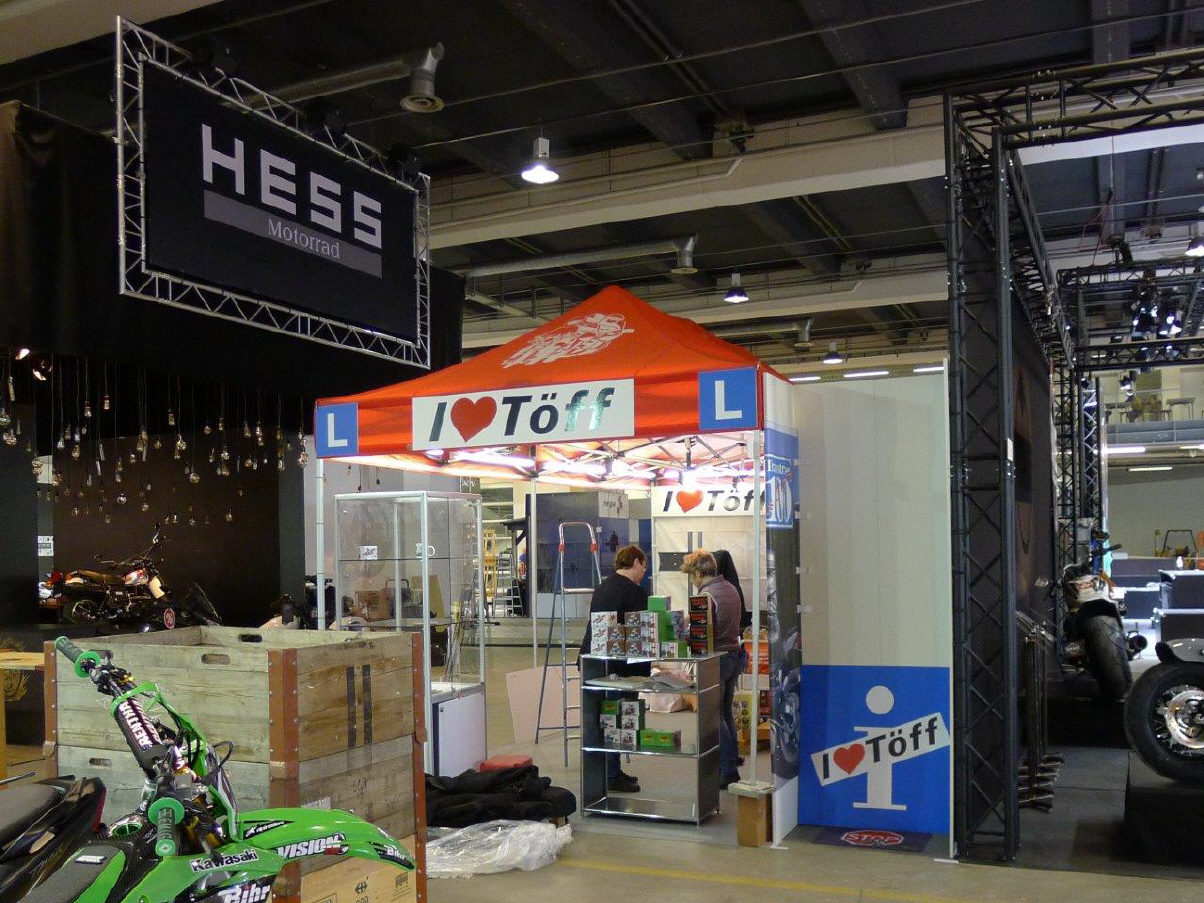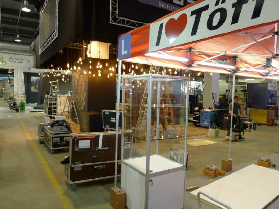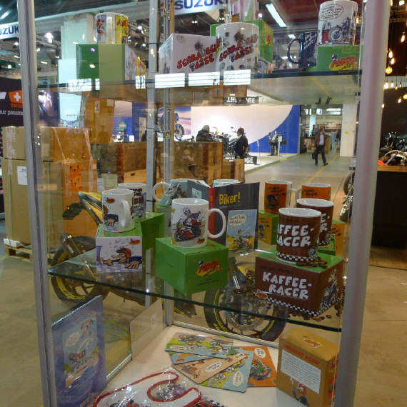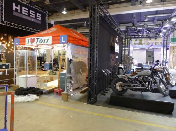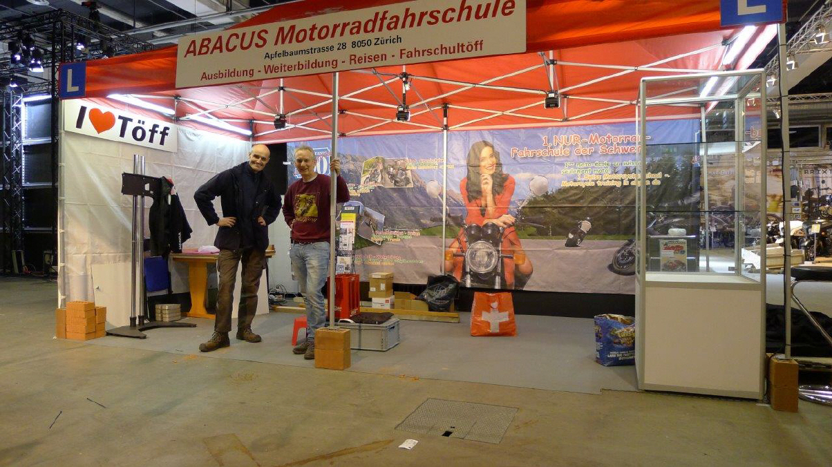Der Mittwoch versprach nochmals einen Marathon: Die Frauen, Elvira, Theres und Karin trafen um 10 Uhr ein. Ich brachte das Material auf die Messe, damit sie die am Dienstag angelieferte Vitrine dekorieren konnten. Elvira macht da immer ein Meisterwerk. Sie war nicht ganz zufrieden mit mir, weil ich in Deutschland noch die «motomania»-Artikel abholen musste, die neun Pakete auch noch verzollen. So richteten sie die Vitrine vorläufig ein, bis ich mit der neuen Ware kam. So viel Neus gab es zwar nicht, denn die angekündigten Tassen «Wo bleibt mein Kaffee?» und «Extra lang» konnten noch nicht ausgeliefert werden. So bleibt bei den Bechern nur der Bambus-Becher für die Frauen übrig. Später kamen Gregor dazu, um die angefangenen Schreinerarbeiten fertig zu machen und Renato, um den Flachbildschirm einzurichten. ES war wieder gegen 8 Uhr, als Gregor und ich das nicht benötigte MAterial mit seinem Kombi zurückfuhren.
