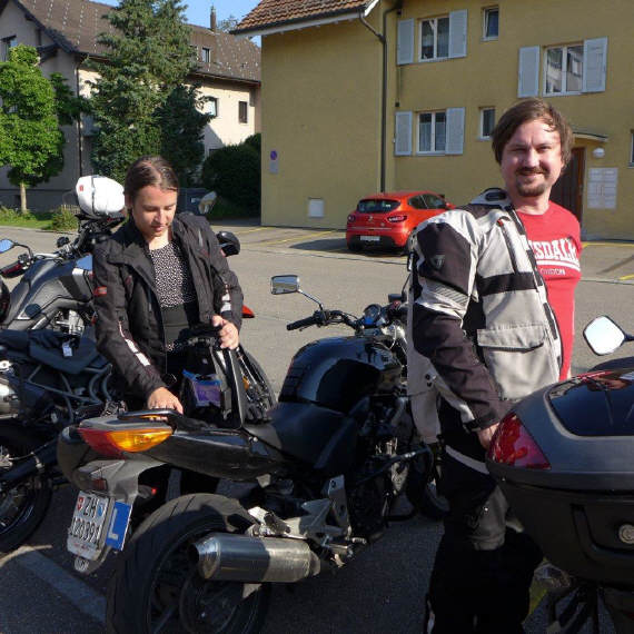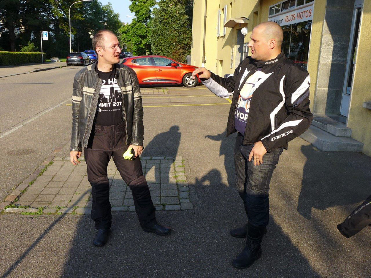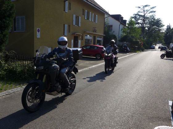 Auch um 18.45 Uhr brachte ich Getränke mit an den Start. Die eingetroffenen Teilnehmenden hatten sich in den Schatten geflüchtet. Romeo hatte seinen Vater mitgebracht, schliesslich bildeten wir mit den drei Tourguides eine Gruppe von 8 Teilnehmenden. Dominik übernahm Romeo, Renato führte zwei L-Fahrer an und ich machte mich auf den Weg mit Ionut und Peter. Viel Spiel bei der Routenwahl blieb nicht, wenn man pünktlich am Ziel sein wollte.