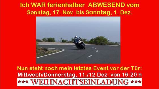 Da lag nichts näher (und das seit vielen Jahren), als sie auf Teneriffa zu verlängern, und das natürlich auf einer 1200er-GoldWing Aspencade! Leider kamen wir am 1.Dez. wieder zurück und nun hat uns der Alltag wieder! Für erste Bilder und den Bericht «klick»e auf obiges Bild, zur «Weihnachtseinladung «klick»e auf das Bild unten!