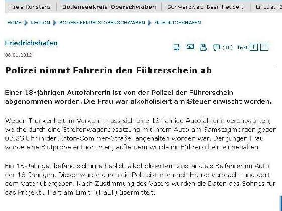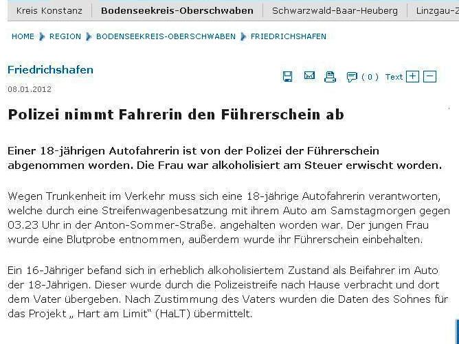 Nach einem Selbstunfall hat eine 24-Jährige in St. Gallen gestern Samstag ihren Führerschein abgeben müssen. Den Führerschein hatte die Frau erst am Freitag erhalten, bereits am Samstagmorgen um 1 Uhr 45 verursachte sie auf der St.-Georgen-Strasse mit 1,8 Promille Alkohol im Blut einen Selbstunfall. Die Frau blieb unverletzt, das Auto wurde stark beschädigt. (sda)