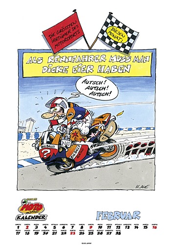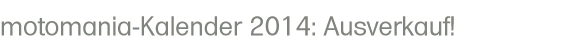 Wer einen «motomania»-Kalender 2014 haben möchte, kann ihn per Mail an urs.tobler (at) datacomm.ch oder unter Tel. 044 313 13 33 bestellenen. Er kann dann an der Tramstrasse nach telefonischer Voranmeldung abgeholt werden. Die einzelnen Monatsblätter kannst Du vergrössert ansehen, wenn Du auf das Bild «klickst»!