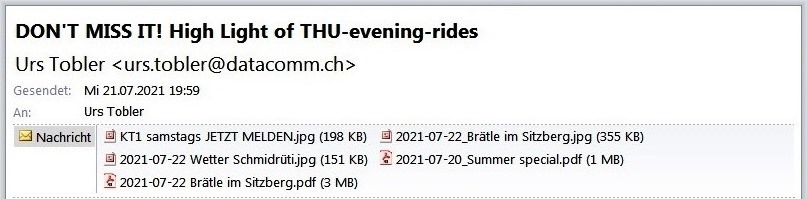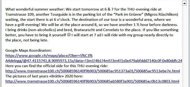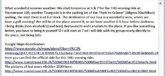 Every Thursday we are starting at Tramstrasse 109 at 7 p.m. for a nice ride: We are riding in small groups to a place, further away when the days are longer and the return on the direct way is never more than 1 hour to Zurich. Learners from a certain level can join us, because it is fun for everybody - we are driving not too fast, keep the speed limits, but we are not doing beginners-speed of 60 kms/hour when it allowed to ride 80! Normally I take the L-riders in my group. If you are not sure, if you are ready for these rides, then ask me before ...