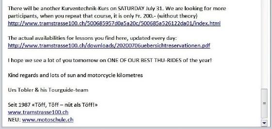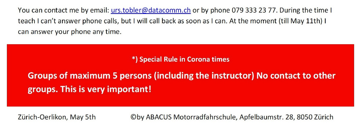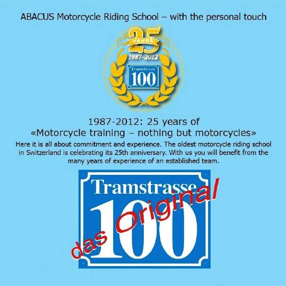 I often get E-mails from people who wants to learn to ride a motorcycle. As long as I don't know what is YOUR start, I can't give you the correct answer! In Switzerland the law gives just a small part what is mandatory, on a very poor level. But at the test, the examiner is sitting on your backseat as pillion-rider and he feels just everything! It is impossible to pass a test with only the mandatory part - I am specialised in motorcycles, since 1982 I am giving lessons in motorcycles: SINCE 1987 I DO NOTHING ELSE THAN THAT! «Töff, Töff - nüt als Töff!» So when you really want to learn properly how to ride a motorcycle, you are with me IN GOOD HANDS! There is nobody in the world who spent so many hours as a pillion-rider on the back of his student-riders, you can believe: About a third of the people learning with me are speaking English, people from all over the world! |