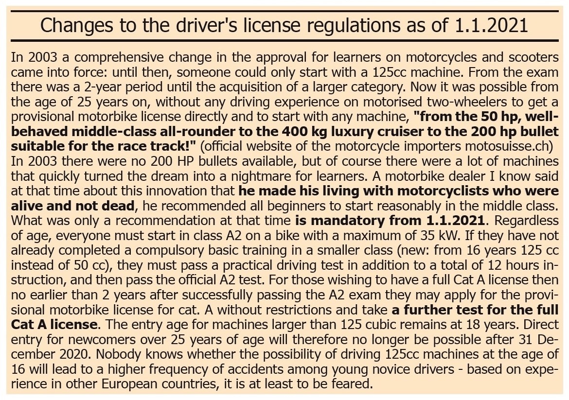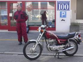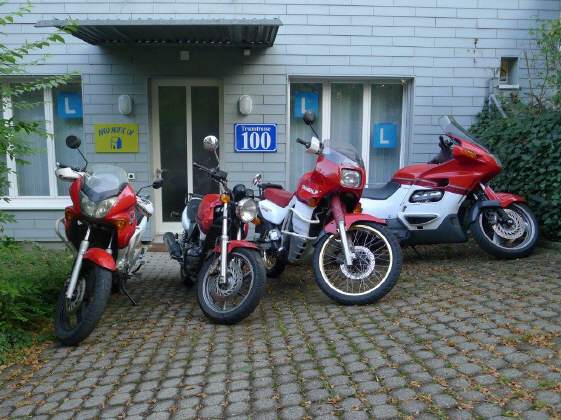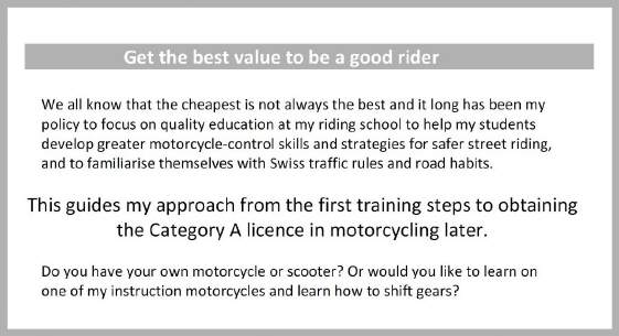 So, you have the choice, if you want to start from the bottom up in safety and with the motorcycle which correspond to your level of riding skills, then contact me and you will get the details for your case. How much that costs? If you call a dentist (my brother is one of them) how much will be the repair of our teeth, he will not be able to say any price unless he could have a look in your mouth ... Before you start buying anything, you can do a test-ride: You don't need anything, no learners permit, no helmet, no jacket to make a test-ride with me on a small (or bigger when your are experienced) motorcycle, what we call «Schnupperstunde». It is a double-lesson in a parking lot, after that ride a can tell you more. |