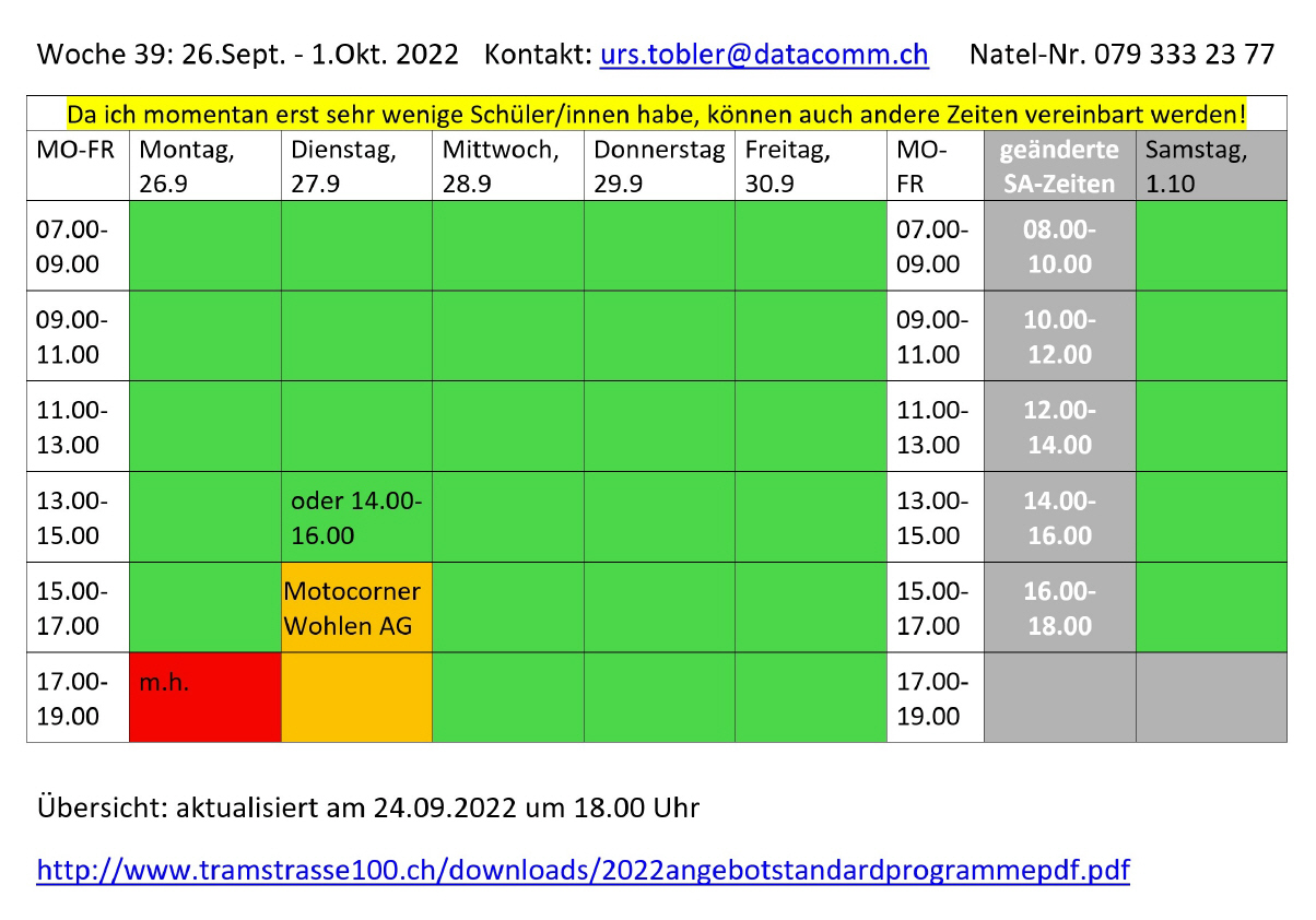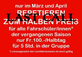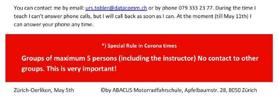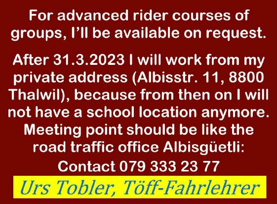 The winter break of the Strassenverkehrsamt Zürich is lasting till April 3rd. I also work in winter, if the temperatures (above 4 degrees, no risk of ice) and good weather conditions. Normally it is very cold in the morning, that's why I make lessons in the afternoon hours. NO MORE NEW CUSTOMERS IN 2023! I am only available for the customers of the past years: 079 333 23 77.