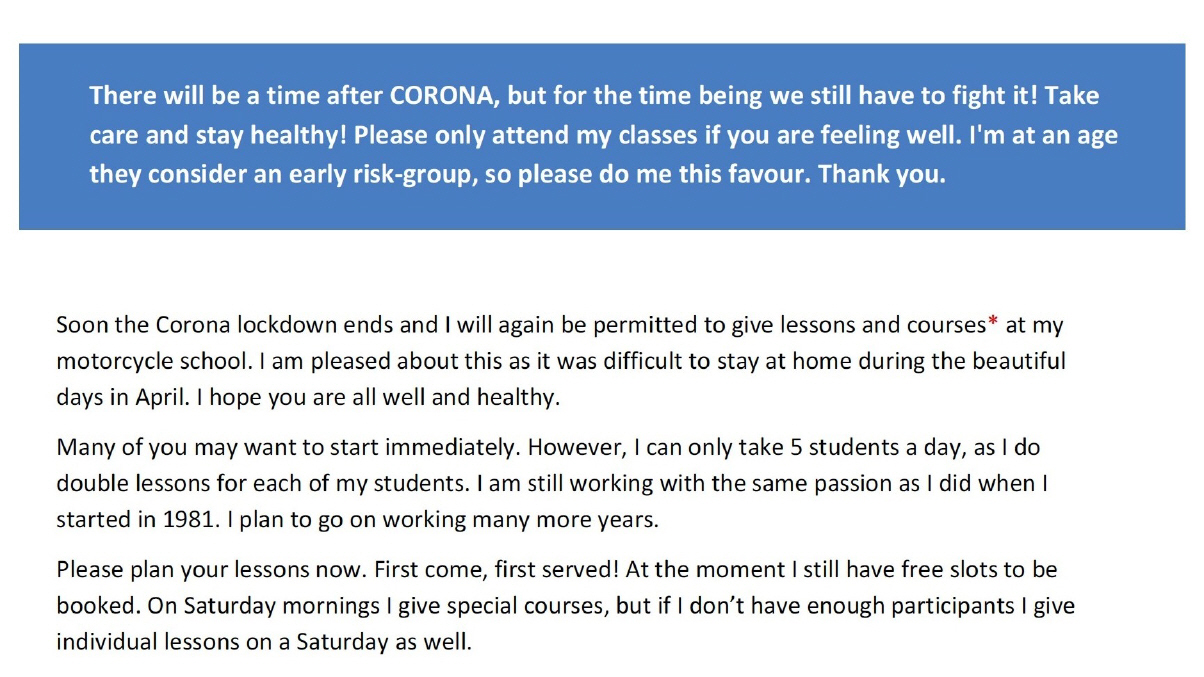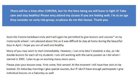 This is a translation of the main points which are valid for learner rider about L-permit in the corona virus crisis