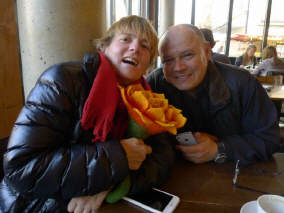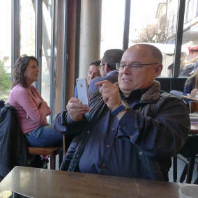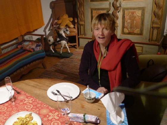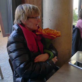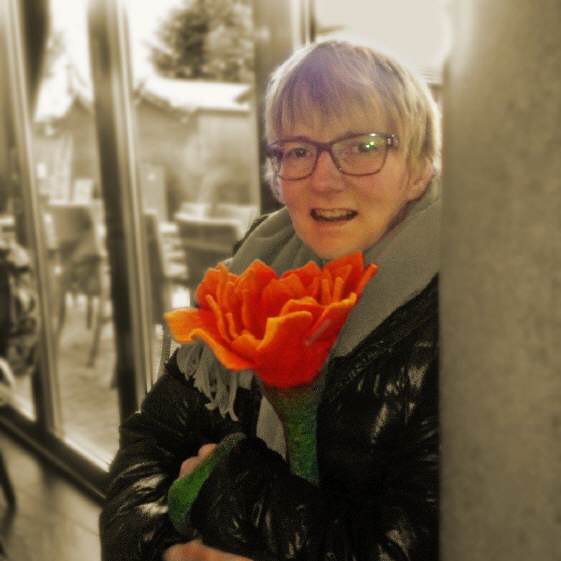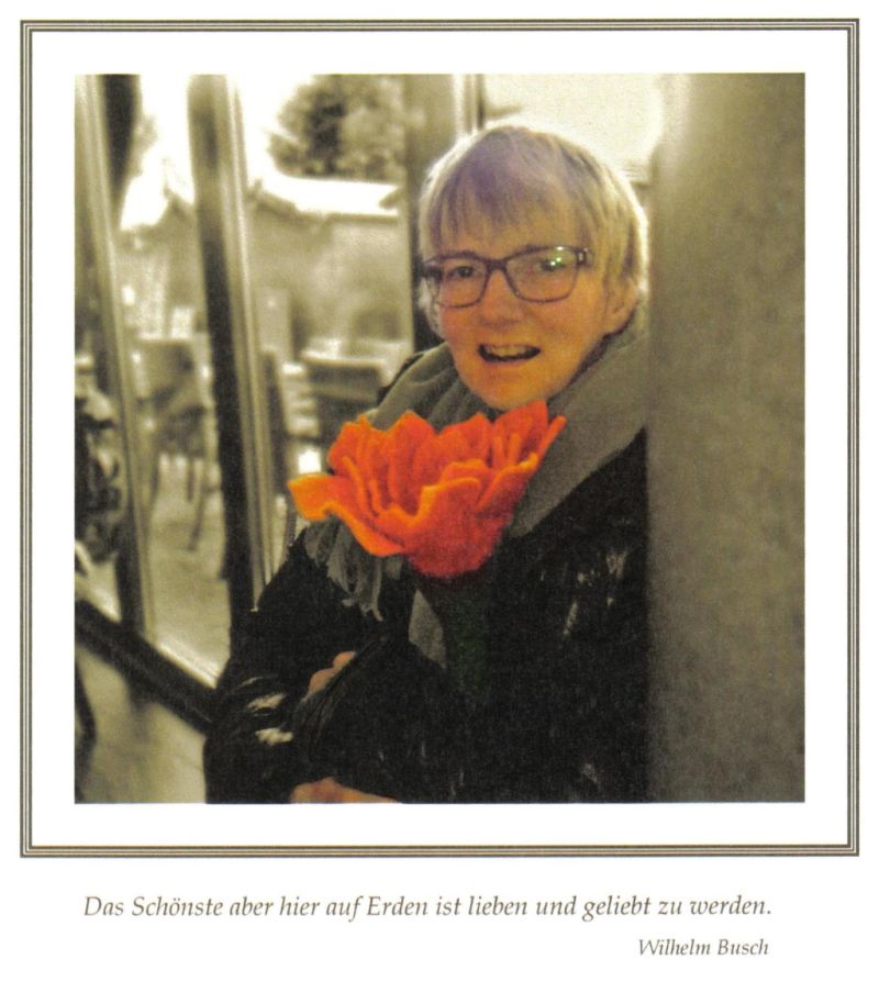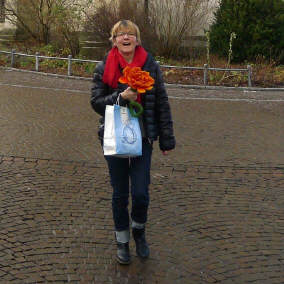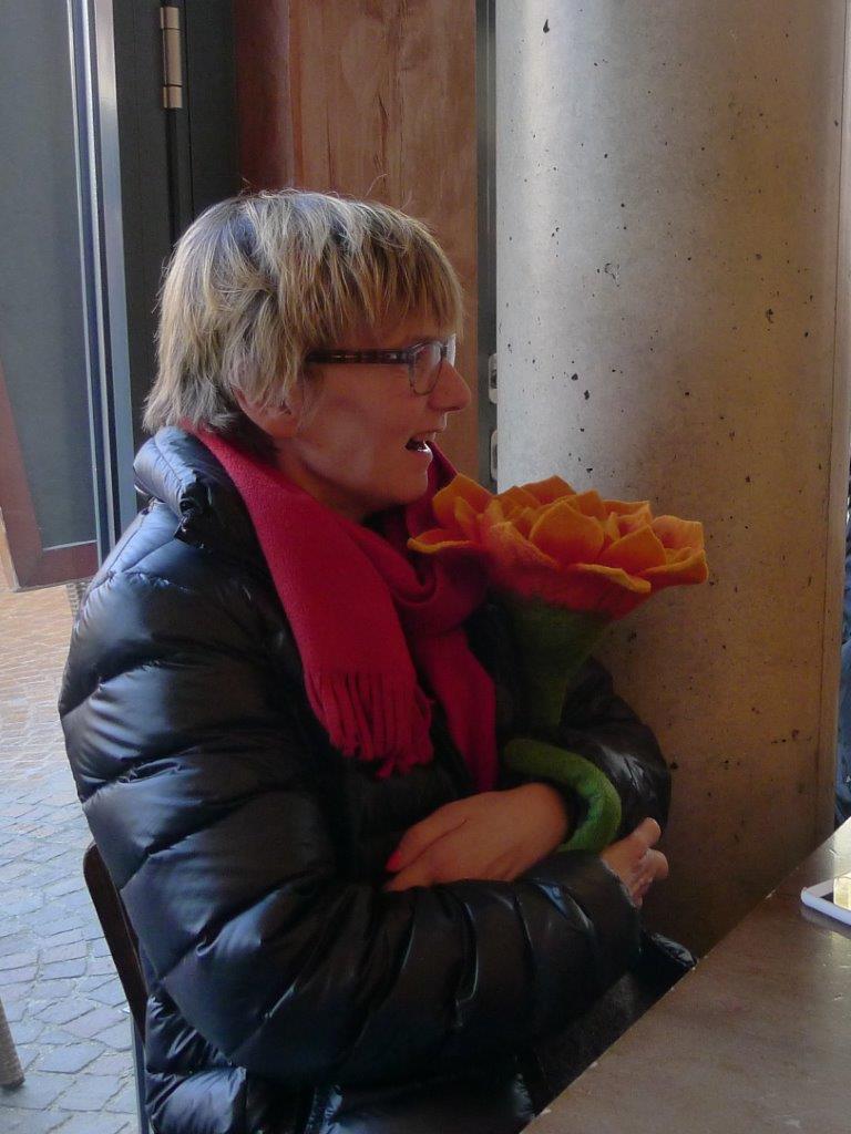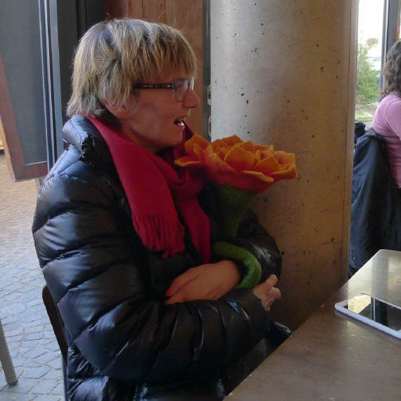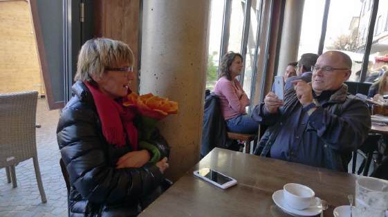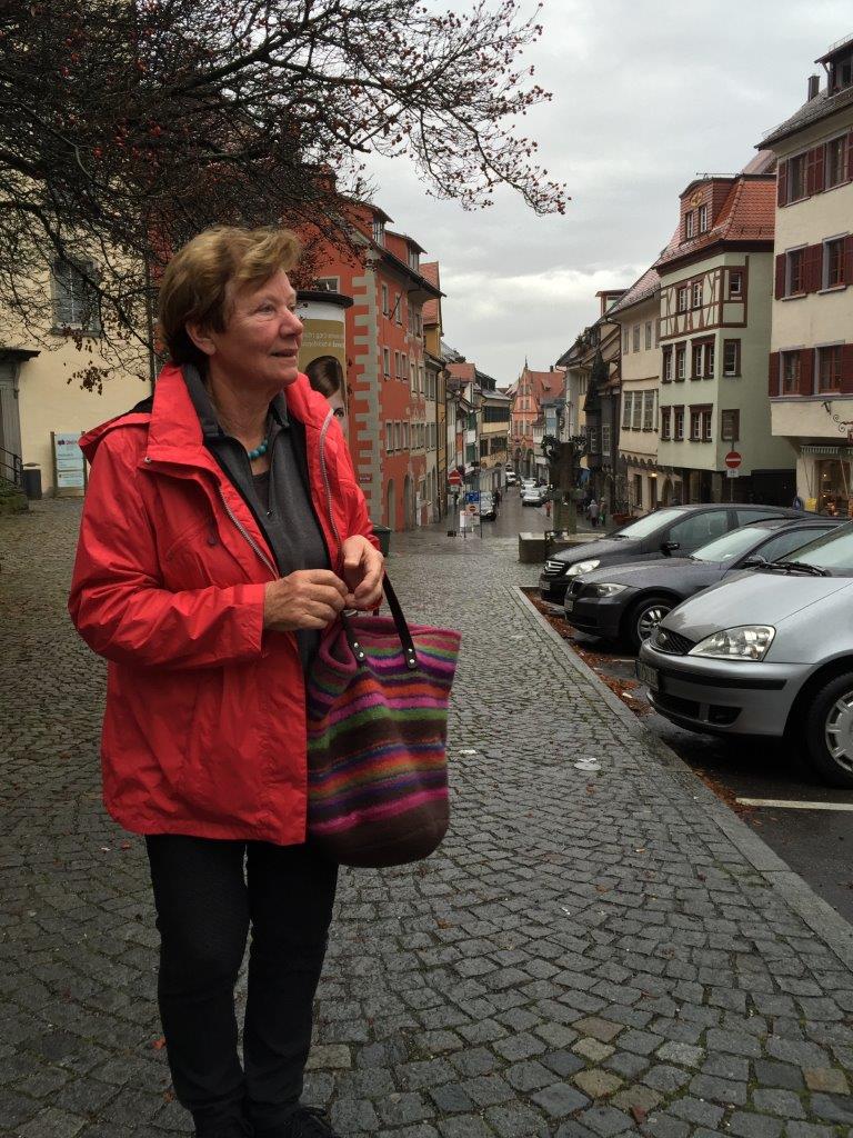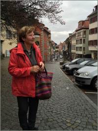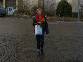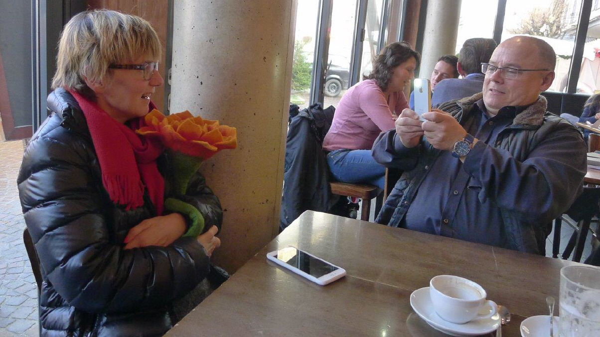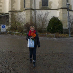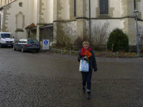 Nachdem wir Siegrun und Dieter besucht hatten, fuhren wir von Bad Schussenried nach Bad Saulgau. Dort trafen wir auf «Erdi», ein Mitglied des BuKi-Vereins. Er wartete auf uns beim Marktplatz, wo wir in der «Kostbar» Platz nahmen. Er brachte Sigrid ein Mitbringsel, eine Blume aus Filz, die sie dann den ganzen Winter mit sich trug. Dass diese Blume schliesslich das Bild liefern sollte für ihr Leidzirkular, ahnte niemand. |