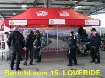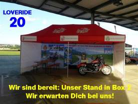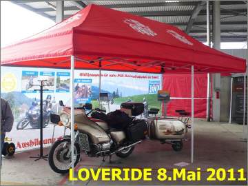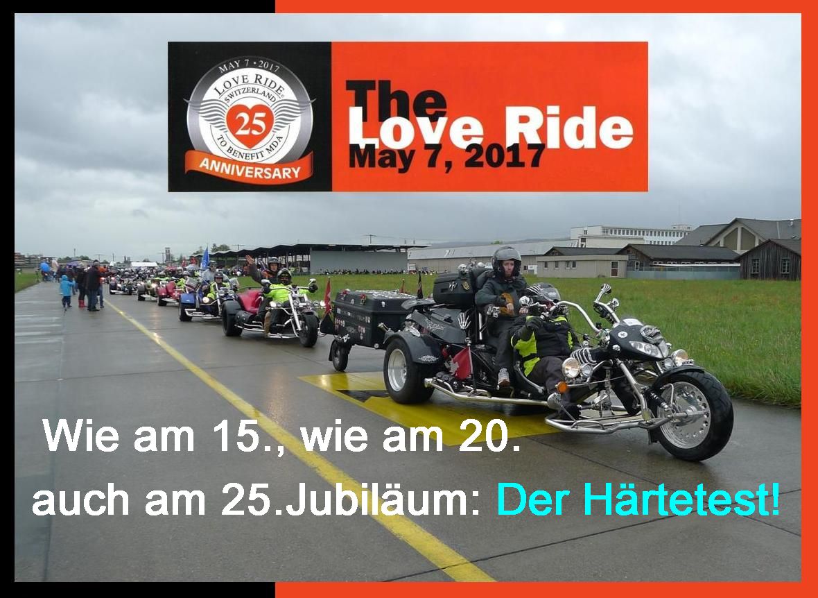 Der LOVERIDE feiert sein 25.Jubiläum, wir feiern unser 30jähriges Jubiläum! Anlässlich des 20jährigen Jubiläums im Jahr 2007 gingen wir erstmals mit unserem Stand an den LOVERIDE. Seither sind wir in jedem Jahr dabei. Der LOVERIDE hat perfekt umgesetzt, was ich anlässlich der Gründung des GoldWing-Club-Schweiz plante, damit ein positives Zeichen zu setzen in der Öffentlichkeit für das Motorrad im Allgemeinen. Mit diesem karikativen Anlass werden jedes Jahr einige Hunderttausend Franken gesammelt, die muskelkranken Mitmenschen zugute kommen. Man kann zu diesem Anlass zu Fuss, mit dem Velo, mit dem Töff (irgendwelcher Marke) oder Roller oder auch mit dem Auto kommen. Jeder Eintritt kostet 30 Franken, die einem guten Resultat an Sammelspenden verhelfen.