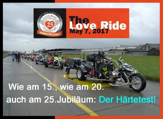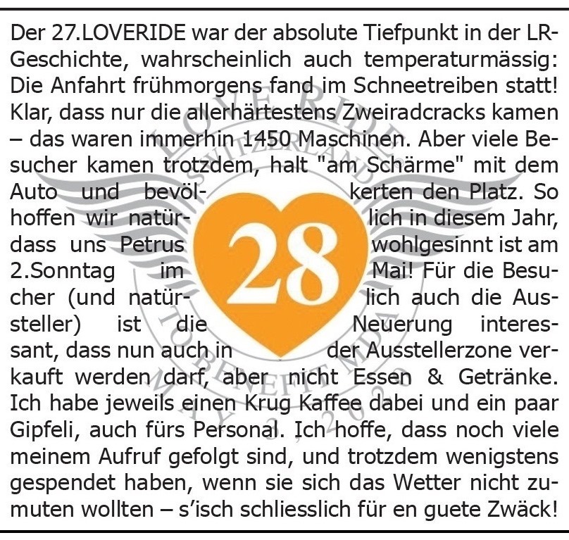 vom LOVERIDE Committee einen Aufruf, nachträglich zu spenden, damit das schlechte Teilnehmer-Resultat (nur etwa 1000 Töffs, 2200 Besucher) für die Empfänger keine Auswirkung hat: Eine unterstützenswerte Idee!