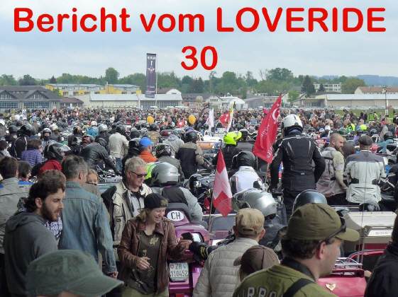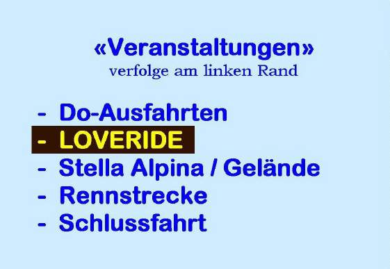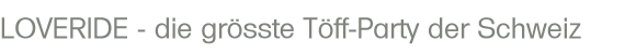 Schweiz entstand, war einer der Gründe, damit positiv in der Öffentlichkeit für die Sache der Töff-Fahrer Werbung zu machen. Dies ist dem LOVERIDE in beeindruckender Weise gelungen: Sie haben jedes Jahr einen grossen Auftritt im Schweizer Fernsehen und dies trägt wesentlich zum besseren Image aller Töff-Fahrer bei. |