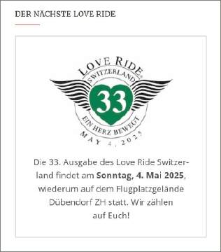 Mehr über den Pfeil oben rechts 2x«Weiter» zu «5. Mai 2024: Verregneter Start am 32.LOVE RIDE!» |
