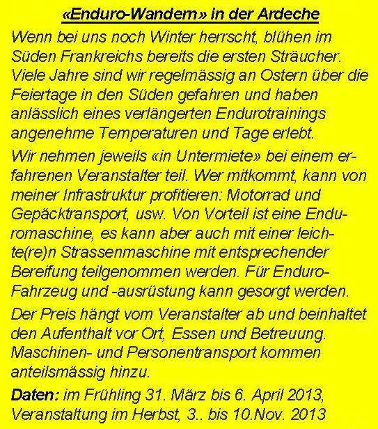 Wer im Frühling gerne seine Saison mit einer schönen Motorrad-Woche beginnen, oder den Herbst Ende Oktober ausklingen lassen will, kann sich bei uns «einklinken»: Sowohl für Geländefahrer/innen mit richtigen Offroad-Töffs (leichte Strassenenduro mit groben Reifen tut's auch, sofern man nicht den Schrammen in Lack und Plastik nachtrauert, falls es solche dabei gibt!), aber auch Strassenfahrer mit bequemen Reisemaschinen, nach Möglichkeit mit langen Federwegen ausgestattet, kommen garantiert auf ihre Kosten. Wir fahren gemeinsam oder auf eigene Faust an, so dass wir uns am Sonntagabend am Reiseziel treffen. Abfahrt mit anderen Teilnehmern ebenso wie der Verlad und die Anfahrt mit Auto und Anhänger kann organisiert werden, sobald die Reisegruppe bekannt ist. Die Rückfahrt erfolgt wieder am Sonntag, eventuell in zwei Reisetagen oder am Montag mit Zusatzübernachtung - in Absprache wie oben. |