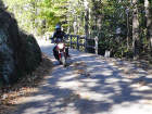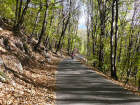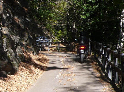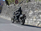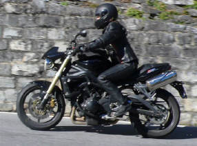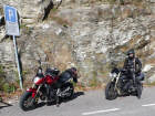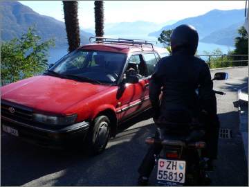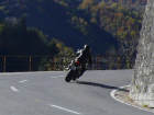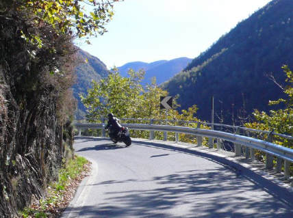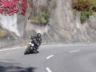 Nun sind wir unterwegs - schon bald wechselt Sigrid auf die «heisse» Triumph: Ich ziehe mit der Honda auf und davon und stelle mich an den Strassenrand, um mein Schätzle bei der Vorbeifahrt abzulichten. Da es nur wenig Verkehr hat, geniesse ich die kurvige Strecke mit vollen Zügen. So eine 600er hat jede Menge Pferde, die man laufen lassen kann, und die Italiener, die mit dem Roller unterwegs sind, fallen fast runter, wenn ich zum x-ten Mal von hinten komme und an ihnen vorbeiziehe! Als ich sie schliesslich mit der Triumph im Tunnel «schnappe», denken sie wohl, der Teufel sei leibhaftig unterwegs, weil das Gerät so infernalisch aus dem Auspuff röhrt... |