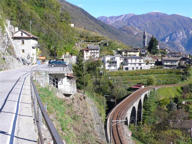 Im Centovalli teilen sich die Eisenbahn und die Strasse den wenigen Platz, der noch übrig blieb. Die Strasse ist eng und der Gegenverkehr ist nahe!