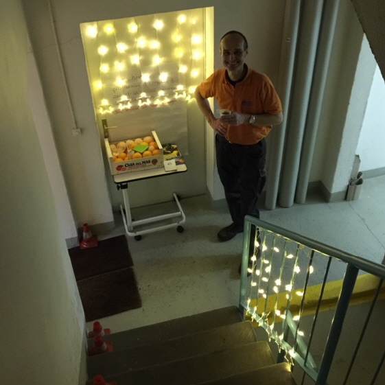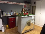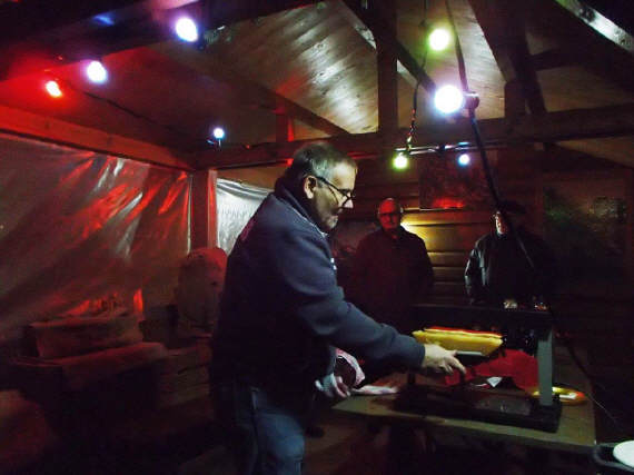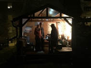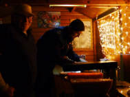 Am Montag starteten Karin und ich mit den Vorbereitungen - die gingen bis tief in die Nacht hinein. Urs und Renato trafen um halb 5 Uhr ein, um die Hütte vis-à-vis im Schulgarten leerzuräumen. Es war nicht die Hütte selbst, sondern der Vorraum dazu, welcher uns zur Verfügung stand. Alles was wir nicht brauchen konnten, luden wir in meinen HiAce-Bus ein. Anschliessend installierten sie den Schaufensterschmuck, eine zeitaufwändige Angelegenheit. Wir waren sehr froh um ihre Mithilfe.