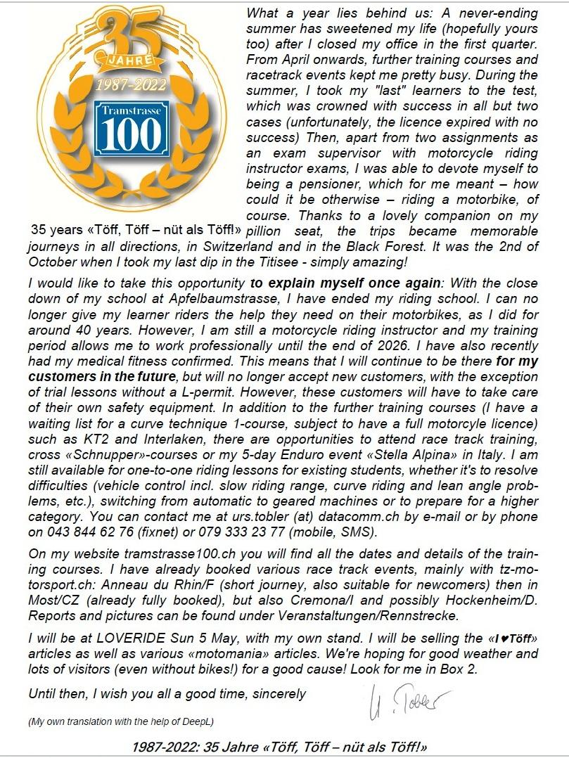 Zweiter Tramstrasse 100-Rundbrief 2022 an meine Kunden, Fans & Freunde als PDF [667 KB]