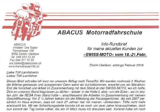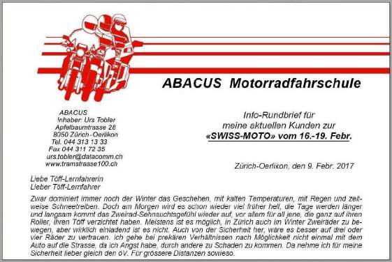 zum SWISS-MOTO-Rundbrief an meine aktuellen Fahrschüler vom 9.Febr. 2017