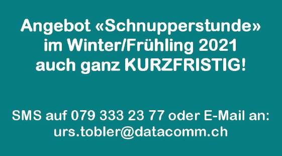 Von April bis Ende Sept. beginne ich jeweils zu den ungeraden Stunden, d.h. von 7-9, von 9-11, von 13-15, 15-17 und 17-19 Uhr. Die Mittagspause ist mir, mit Ausnahme von Prüfungsbegleitungen, heilig. |