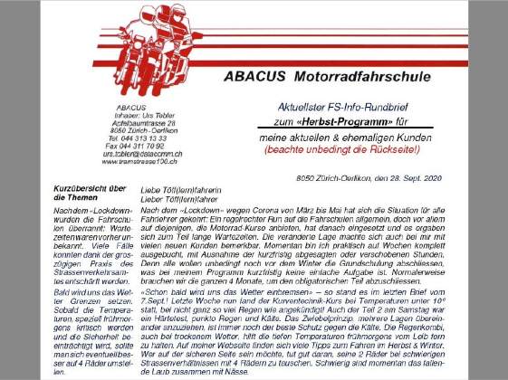 Situation Ende Oktober (Stand: 26.Okt.) Inzwischen haben die meisten meiner Fahrschüler/innen die Testfahrt am Zürichberg bestanden und können den letzten Teil der obligatorischen Grundschulung am kommenden Samstag in Angriff nehmen: Die Wetteraussichten sind gut und wir werden bestimmt einen tollen und lehrreichen Kurs durchführen können. Damit entspannt sich auch die Lage in meiner Agenda. Es gibt wieder vereinzelt «Löcher», welche für neue Fahrschüler/innen zur Verfügung stehen. Da nach wie vor eine sehr grosse Nachfrage nach Kursplätzen besteht, könnte ich mir vorstellen, allenfalls vereinzelt lernwillige A1-Kandidat(inn)en noch vor dem Winter anzunehmen. Da der Teil 2 individuell stattfindet, werden wir für den Teil 1 und Teil 2 des Fahrzeugbeherrschungskurs bestimmt entsprechende Kurstage mit dem notwendigen Wetter finden können.