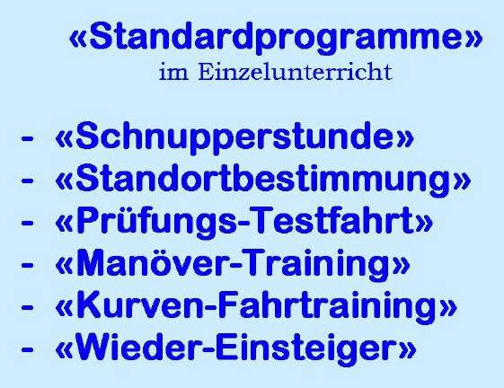 Fahrstunden gibt's im Einzelunterricht von Montag, 07.00 bis Freitag, 19.00 Uhr, samstags 8-16 Uhr (Kurse haben Vorrang) |