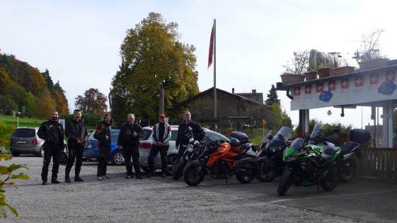 Am Sonntag, 19.Okt. fand die Schlussfahrt der "Sunset-Riders" statt. Der "Präsi himself" amtete als Tourguide, und er setzte sie um 10 Uhr für den Start und 13 Uhr mit dem Ziel, dem Mittagessen im Restaurant an. Es waren nur 5 Teilnehmende, aber der Tag startete recht kühl und viel wärmer sollte es auch nicht werden. Als Teilnehmer aber muss ich sagen, dass, richtig angezogen, es ein unwahrscheinlich angenehmer Töfftag war: Fast kein Verkehr (und noch viel weniger auf den gewählten kleinen Strässchen), wunderbare Sicht auf die farbigen Herbstwälder, hervorragende Strassenverhältnisse von ein paar landwirtschaftlich bedingten saisonalen Verschmutzungen und Kurven-à-gogo-Strecken, tolle Töffkollegen und gute Gespräche bei Pausen und Mittagessen, und danach ...  |