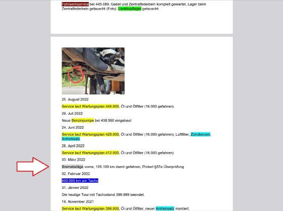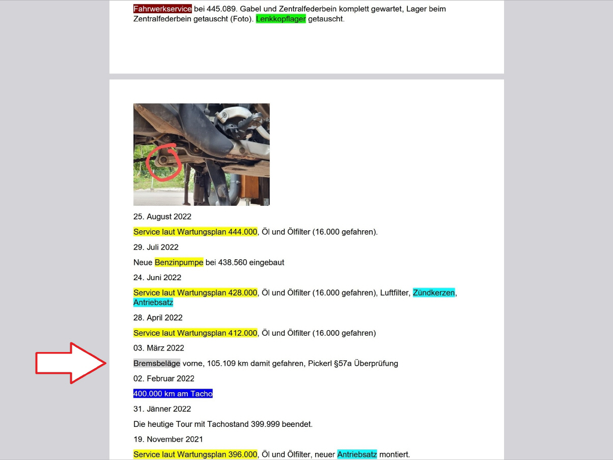 Da er (wie oben angemerkt) versucht, möglichst mit dem Motor zu bremsen, um die Belastbarkeit des DCT-Getriebes auszuloten, fährt andere Rekorde ein: Er ist zügig unterwegs, hat viel Fahrspass auf seinen Fahrten - und fährt mit den Vorderbrems-Belägen 105'109 Kilometer! Weitere Teile: Bei 438'560 km eine neue Benzin-Pumpe, bei 445'089 km neues Lager beim Zentralfederbein und Lenkkopflager ausgetauscht. Regelmässig Probleme verursachte der Schaltmotor (der beim DCT-Getriebe die Gänge einlegt), sowie die Benzinpumpe, die ebenfalls mehrfach getauscht werden musste. Lenkkopflager, Radlager, Erneuerung des Kettensatzes gehören zu den Verschleissteilen, die besonders wegen dem Winterbetrieb angefallen sind. Die ganze Unterhalts-Dokumentation ist fast so spannend wie ein Krimi. Die Maschine musste ganz selten per Hänger in die Werkstatt zur Diagnose und Reparatur gefahren werden. Und das über bald insgesamt 600'000 Fahrkilometern verteilt über 10 Fahrsaisons.