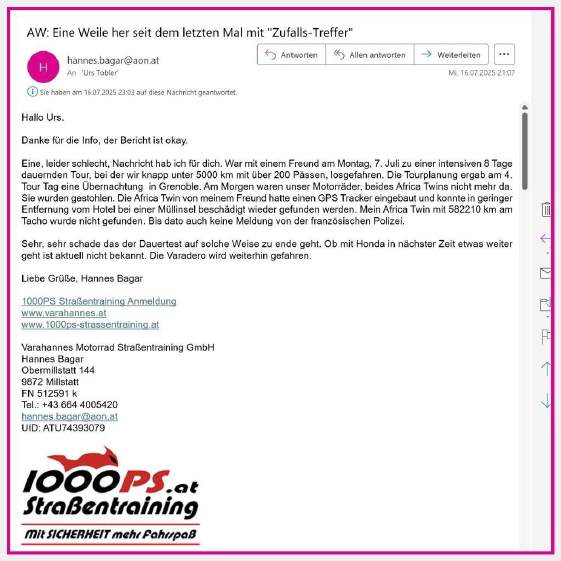 Up date: (Stand: 30.6.2025) Der Motorrad-Enthusiast (bei uns würde man ihn wohl «Töff-Verrückter» oder «Töff-Spinner» nenen) ist inzwischen weitergefahren, sowohl mit der Africa Twin (bei ihm AT genannt) wie auch mit seiner geliebten Varadero. Als letzte Kilometerstände fand ich auf seiner Webseite folgende Einträge: