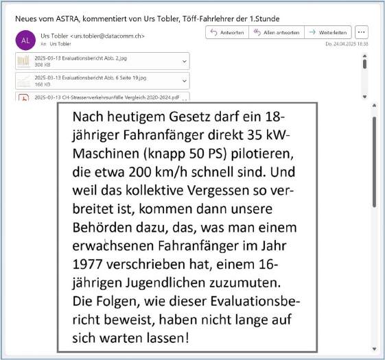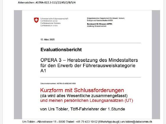 Basierend auf dem Original des Evaluations-Berichts (28 Seiten) vom 13.03.2025 mit Kommentar zu der neuen Kategorie A1 125 Kubik für 15- bis 17-Jährige als PDF [2'740 KB]