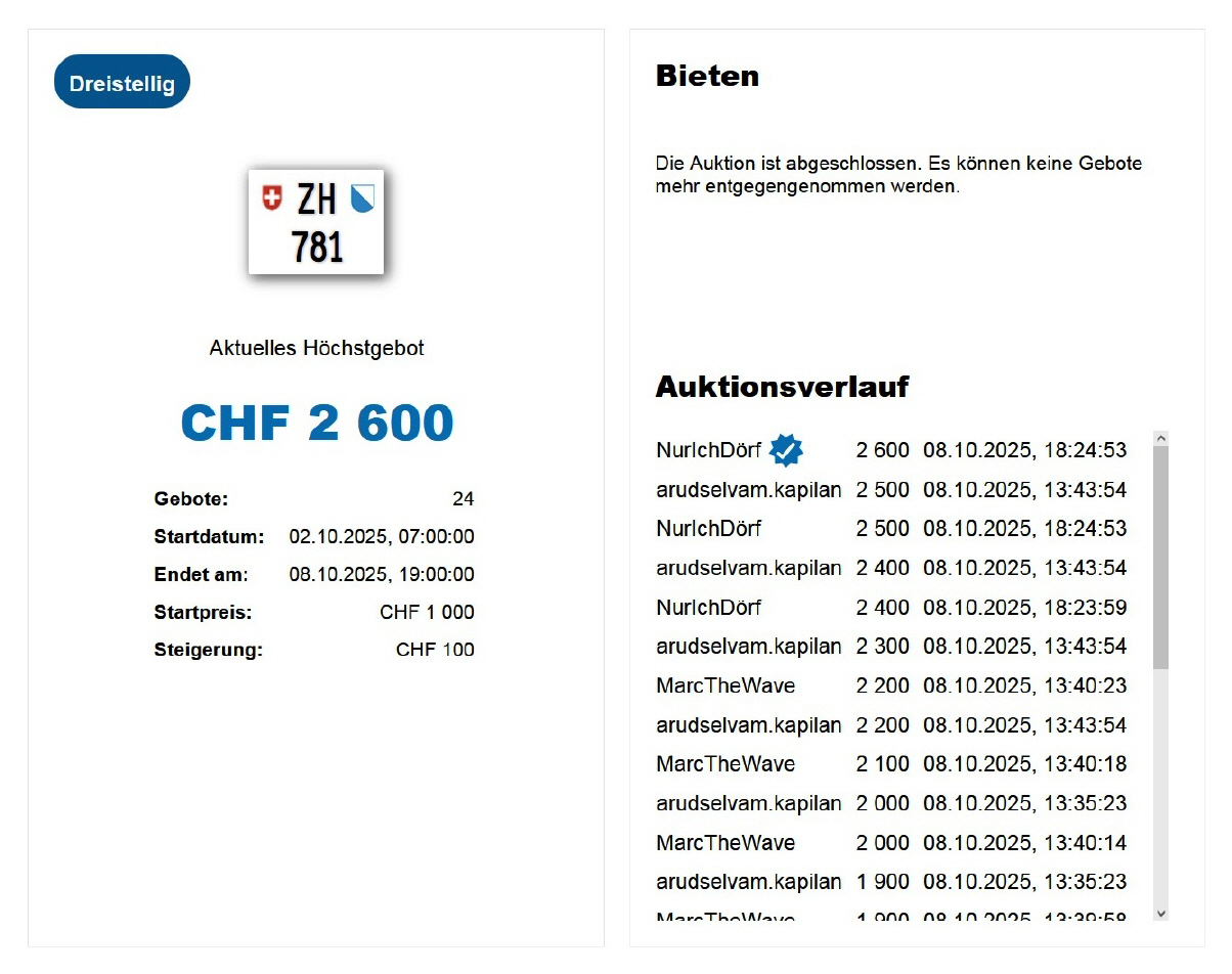 Am 25.11.2020 wurde im Kanton Zürich das 3-stellige TÖFF-Nummernschild ausgegeben - in der Auktion ging es für Fr. 4000.- weg: Auch hier boten sich zwei Bieter hoch! Verfolge den Verlauf vom «ZH 701