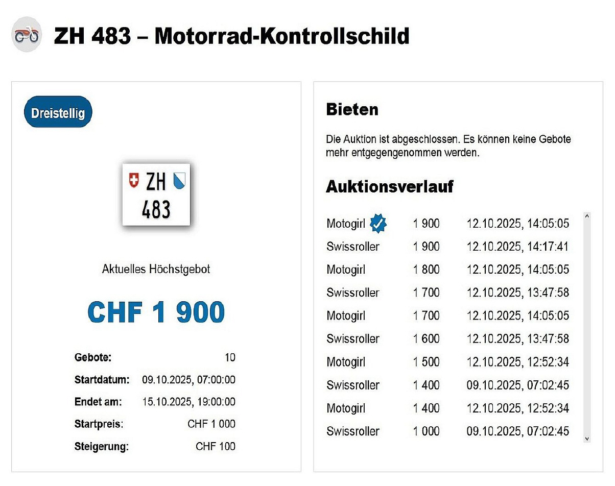 Erste Töffnummer ZH «894» ging für Fr. 4'100.- |