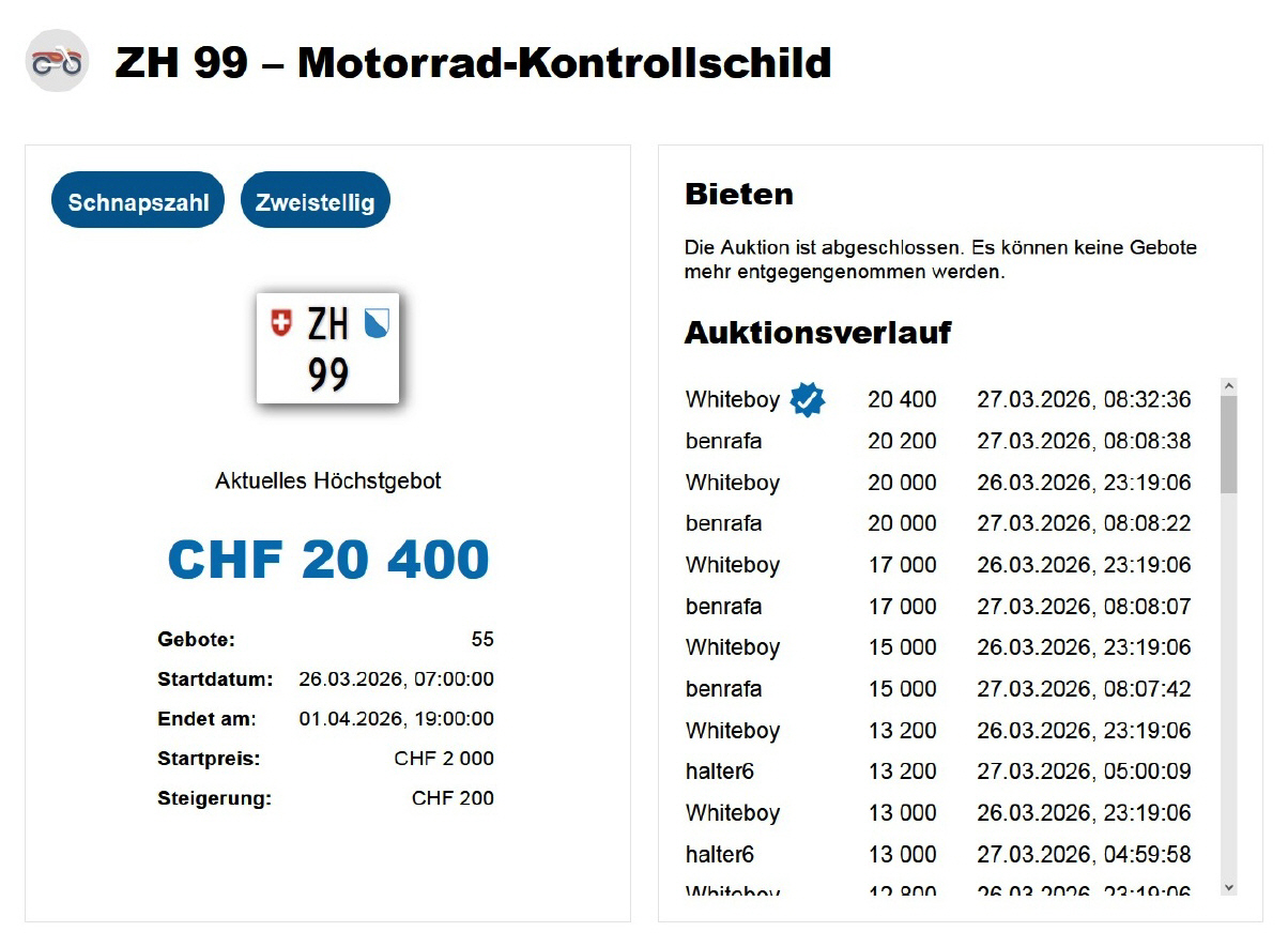 Als ich am Freitagabend schauen wollte, was mit dem Schild «ZH 100» abgeht, lag der Bieterbetrag bereits bei 380'800.-, doch war es nicht möglich, zu bieten. Gemäss 20min konnte das Strassenverkehrsamt die Bonität der Bietenden überprüfen (aufgrund der neuen AGB) und alle Personen, die gar nicht so viel Geld hatten, wurden gesperrt. |