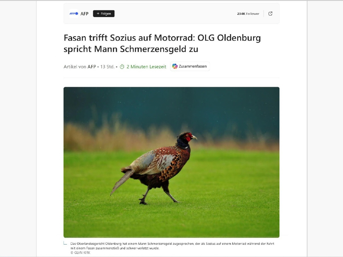 Auch diese Meldung ist wohl ziemlich einmalig! Ein Motorrad fährt ausserorts, am Strassenrand startet ein Fasan und auf seinem (Flug-)Weg trifft er den Beifahrer am Helm, welcher vom Motorrad stürzt - dummerweise nur mit einem Helm ausgerüstet! Mehr dazu hier [1'907 KB]