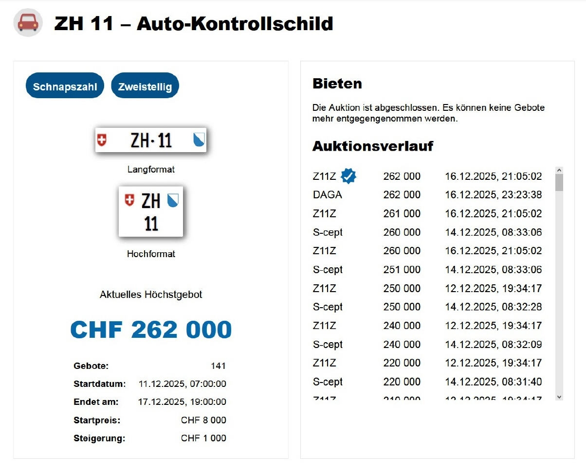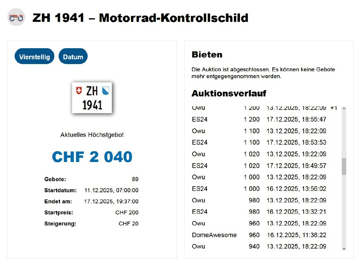 Fahrzeugschild ersteigern (Bsp. Kanton ZH) AKTUELL: Versteigerung vom 17.Dez. 2025 |