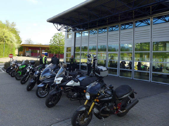 Da ich das Areal des Strassenverkehrsamtes mieten muss, brauche ich mindestens 6 zahlende TN, um den Kurs durchzuführen. Meistens findet er vor dem WB-Kurs in Interlaken statt, wobei Oster- bzw. Pfingstsamstag bisher eher ein Handicap war. Aufgrund der katastrophalen Wettersituation um den 20. April musste der Kurs in Interlaken kurzfristig abgesagt werden. Als ich dann eine Woche vor Pfingstsamstag erstmals die srf-meteo konsultierte, erlitt ich einen Schock – ging aber ohne Notarzt über die Bühne – im Hinblick auf das KT2-Programm: Nach dem KT1-Kurs, in welchem es in erster Linie um eine saubere Kurvenfahrtechnik (Kurvenlinie, Blicktechnik und Geschwindigkeitsgestaltung) geht, sollten im Kurs 2 die fahrer- und maschinentechnischen Reserven erkundet werden. Nasse Fahrbahn ist da ein brutaler Spielverderber, im Gegensatz zum KT1, wo oft die Teilnehmenden im Regen schräger gefahren sind als je zuvor.