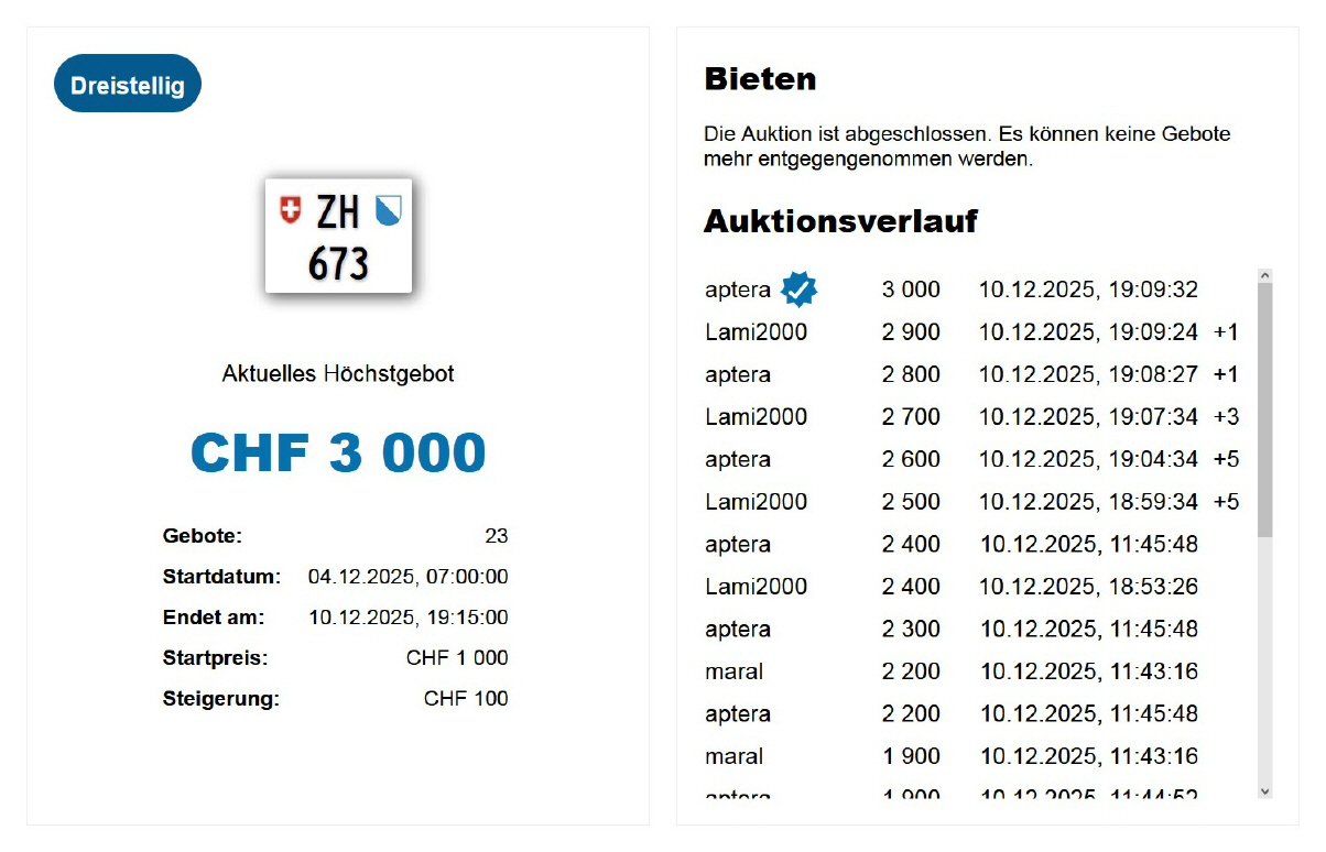 Am 10.12.2025 wurde im Kanton Zürich das nächste 3-stellige TÖFF-Nummernschild ausgegeben - in der Auktion ging es zum für die Saison sehr guten Preis von Fr. 3000.- weg! Verfolge den Verlauf vom «ZH 673